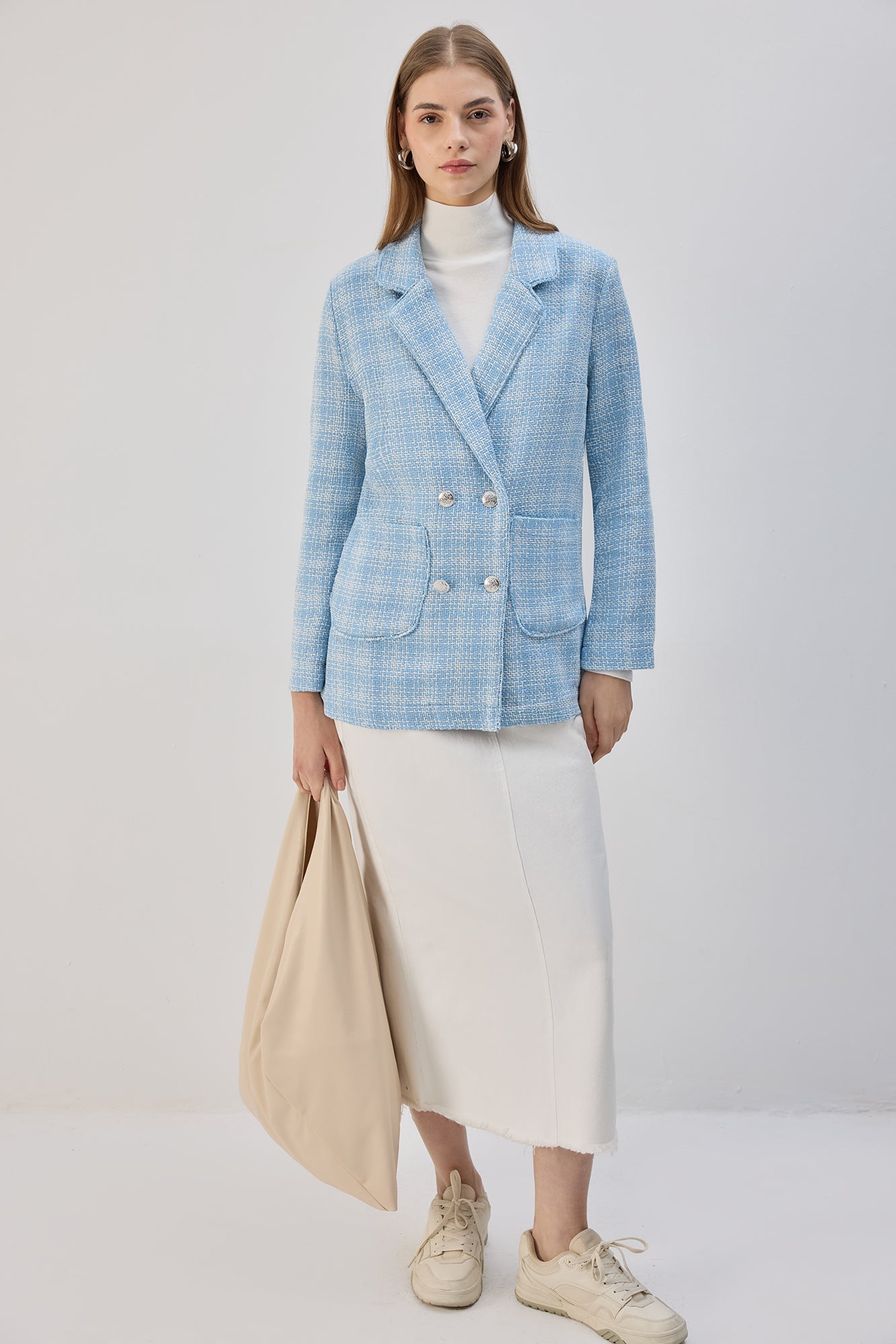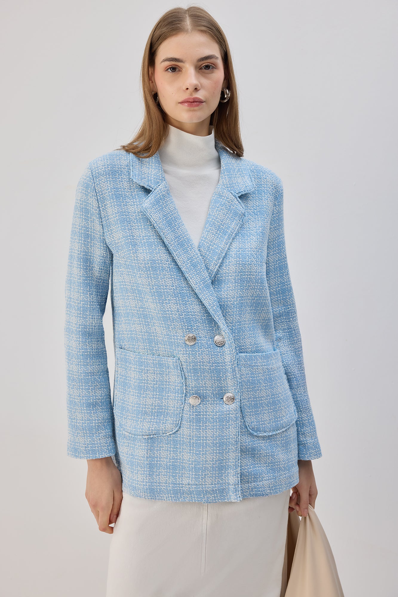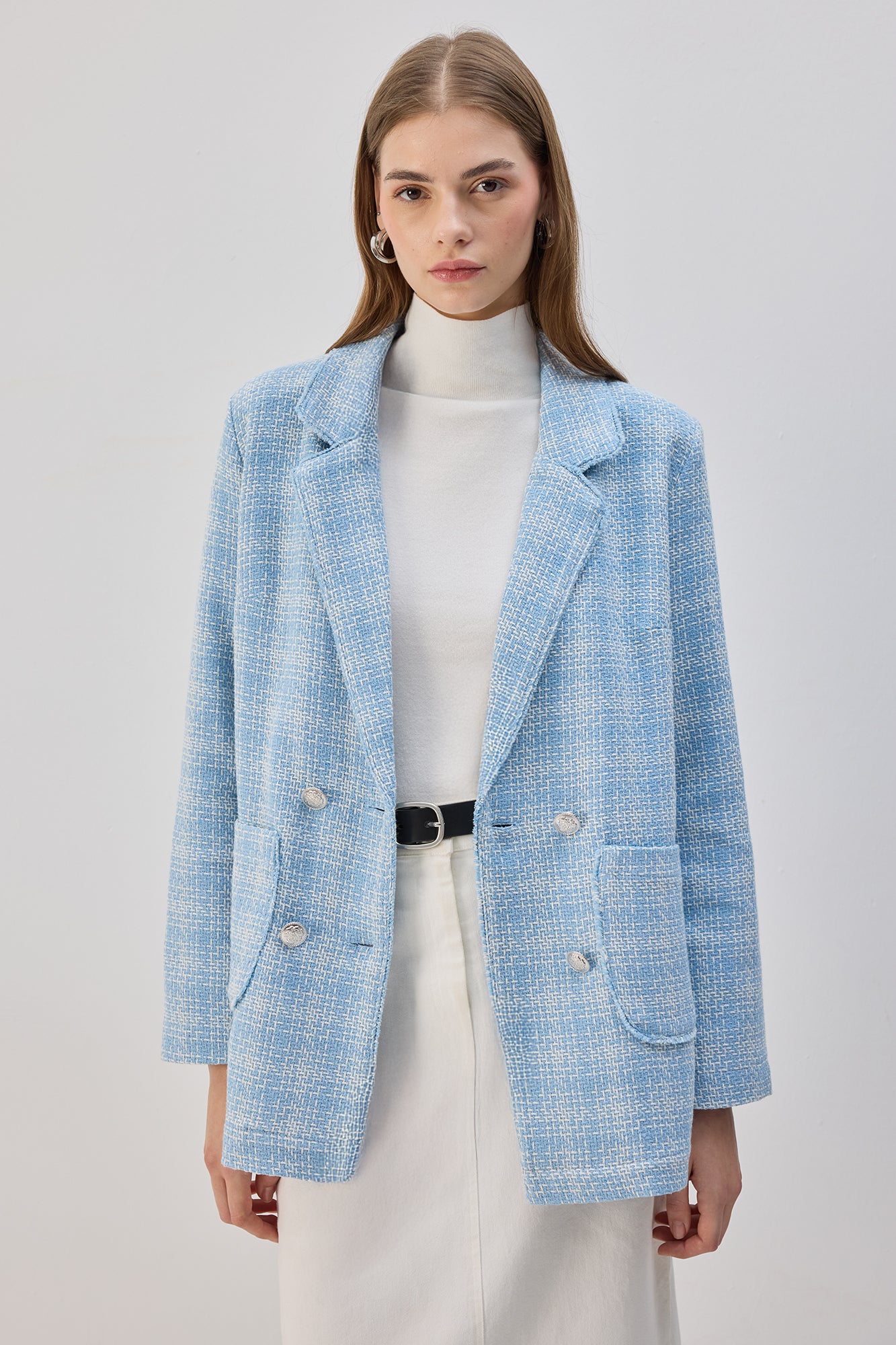 This Belted Tweed Blazer Jacket is a timeless statement piece, blending sophistication with a structured silhouette. Designed with a double-breasted front, gold-tone buttons, and functional flap pockets, it exudes effortless elegance. The refined tweed fabric adds texture and charm, making it a versatile layer for both casual and formal looks. Pair it with tailored trousers for a polished ensemble or with denim for a chic, contemporary feel.