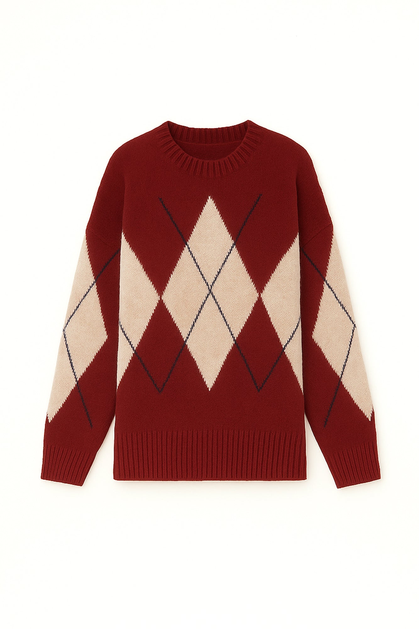 This Diamond Patterned Knit Sweater combines cozy comfort with timeless style. Featuring a bold diamond motif in contrasting colors, this sweater is crafted from a soft knit fabric that ensures warmth and comfort. The relaxed fit and ribbed cuffs make it a versatile piece, perfect for pairing with jeans or tailored trousers for a chic winter look.