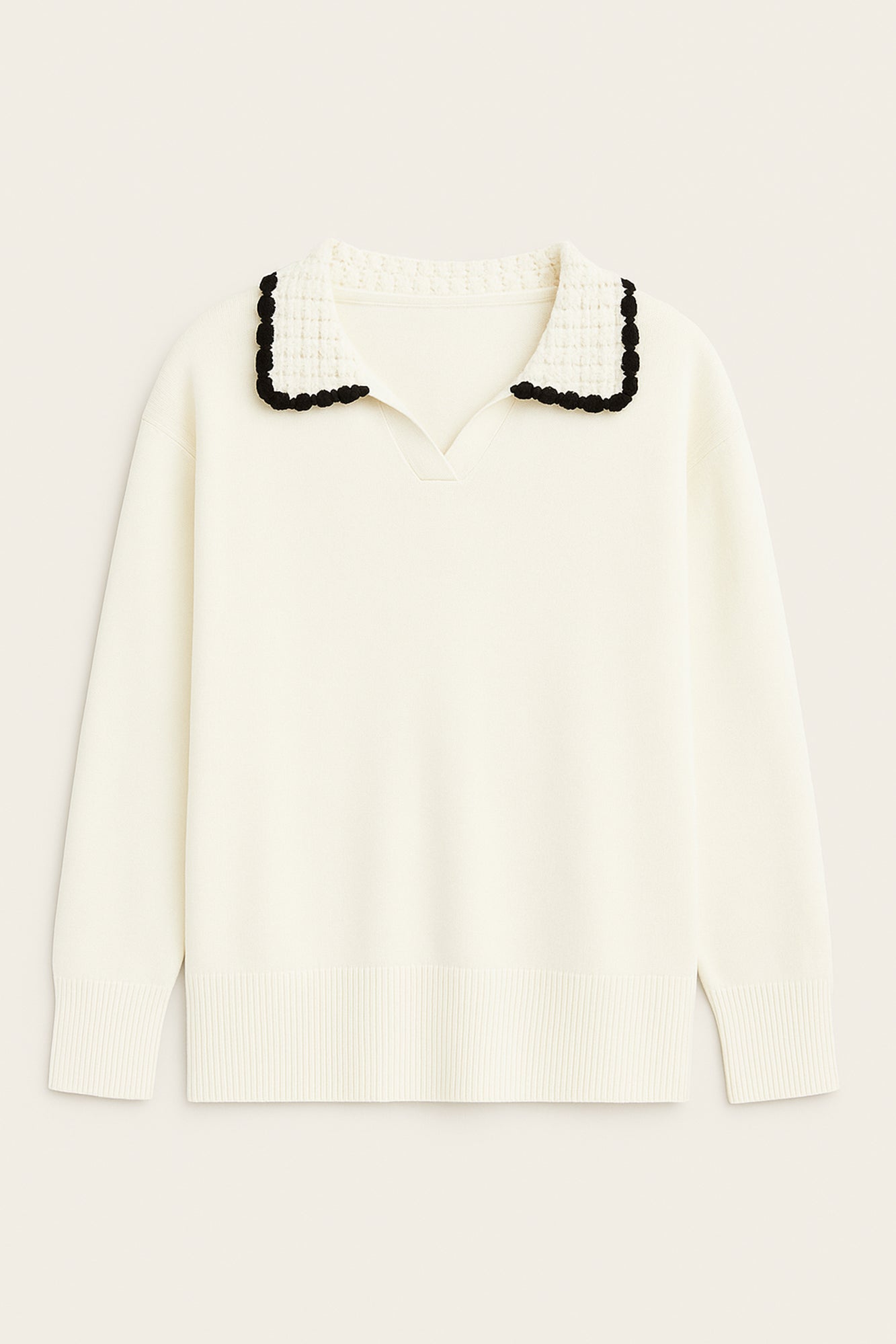 This Knit Sweater with Crochet Detail offers a unique, stylish twist with its contrasting crochet collar. The creamy white hue enhances the softness and warmth of the knit fabric, while the collar adds an artisanal touch, perfect for a chic and cozy look. Paired with high-waisted, maroon trousers, this ensemble gives off an effortlessly stylish vibe. The slightly oversized fit provides comfort without sacrificing style, making it a versatile addition to both casual and smart-casual wardrobes. The combination of textures and colors makes this piece stand out, ensuring you'll make a lasting impression.