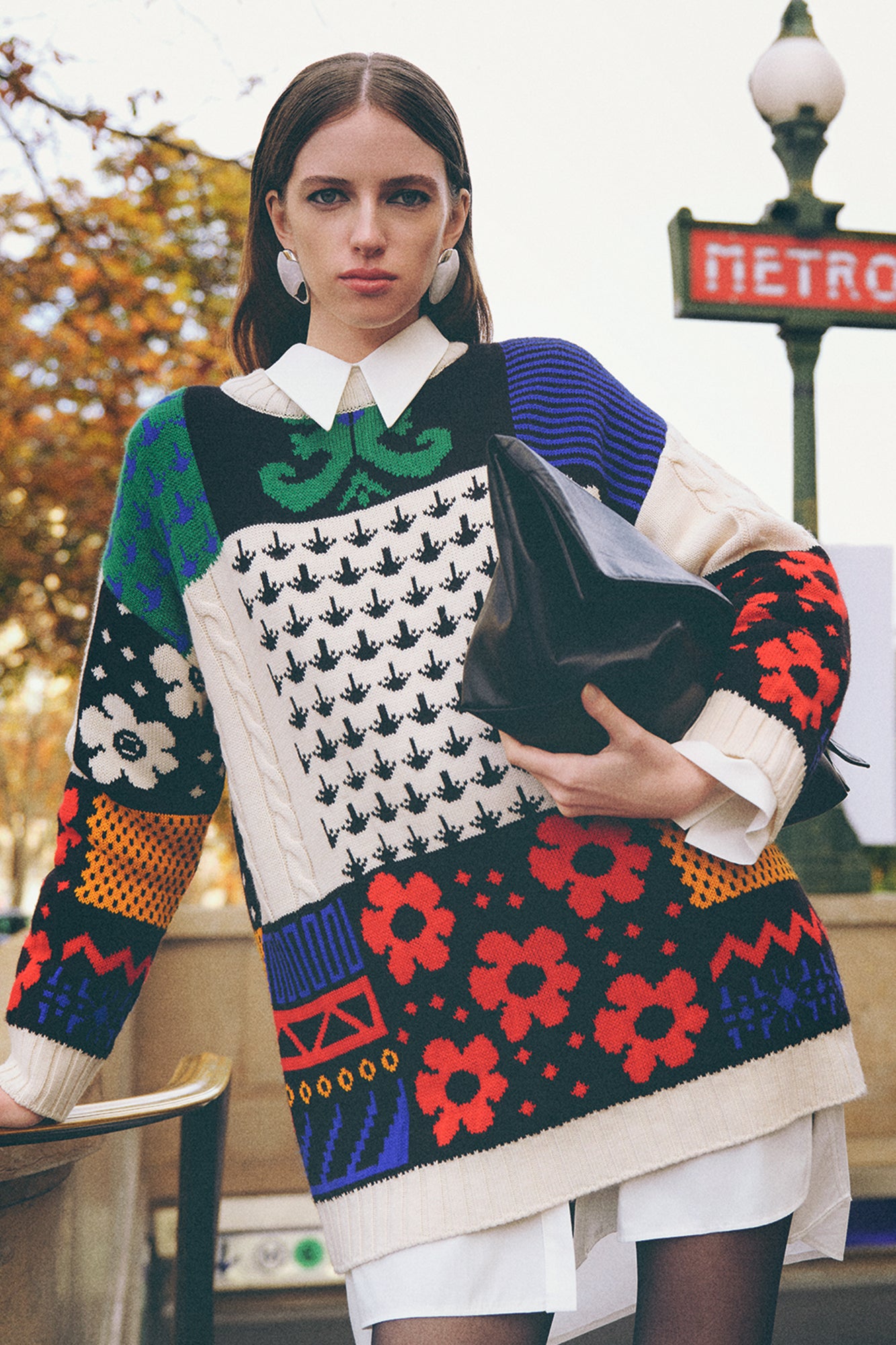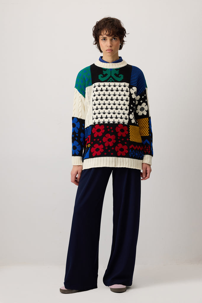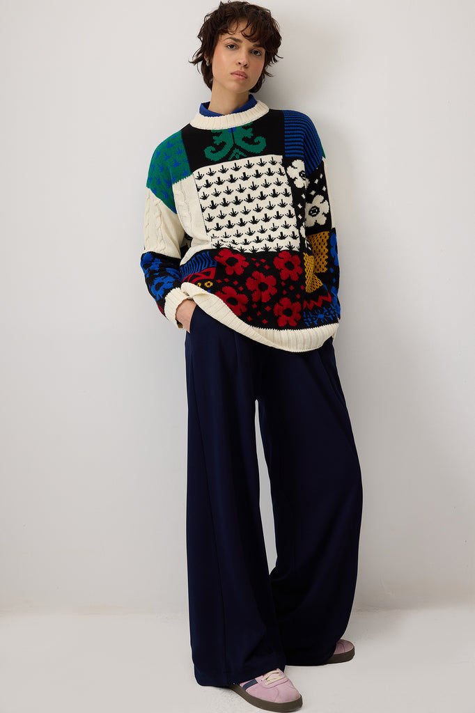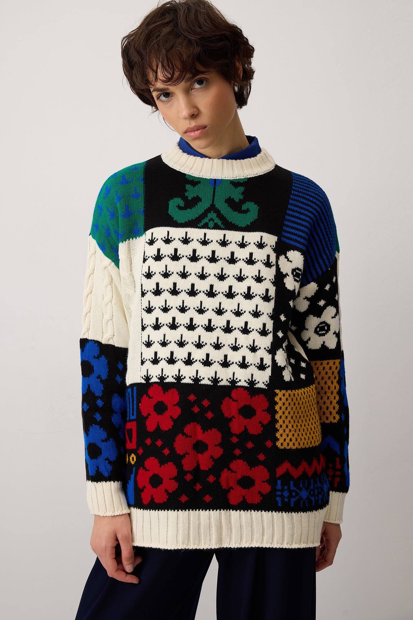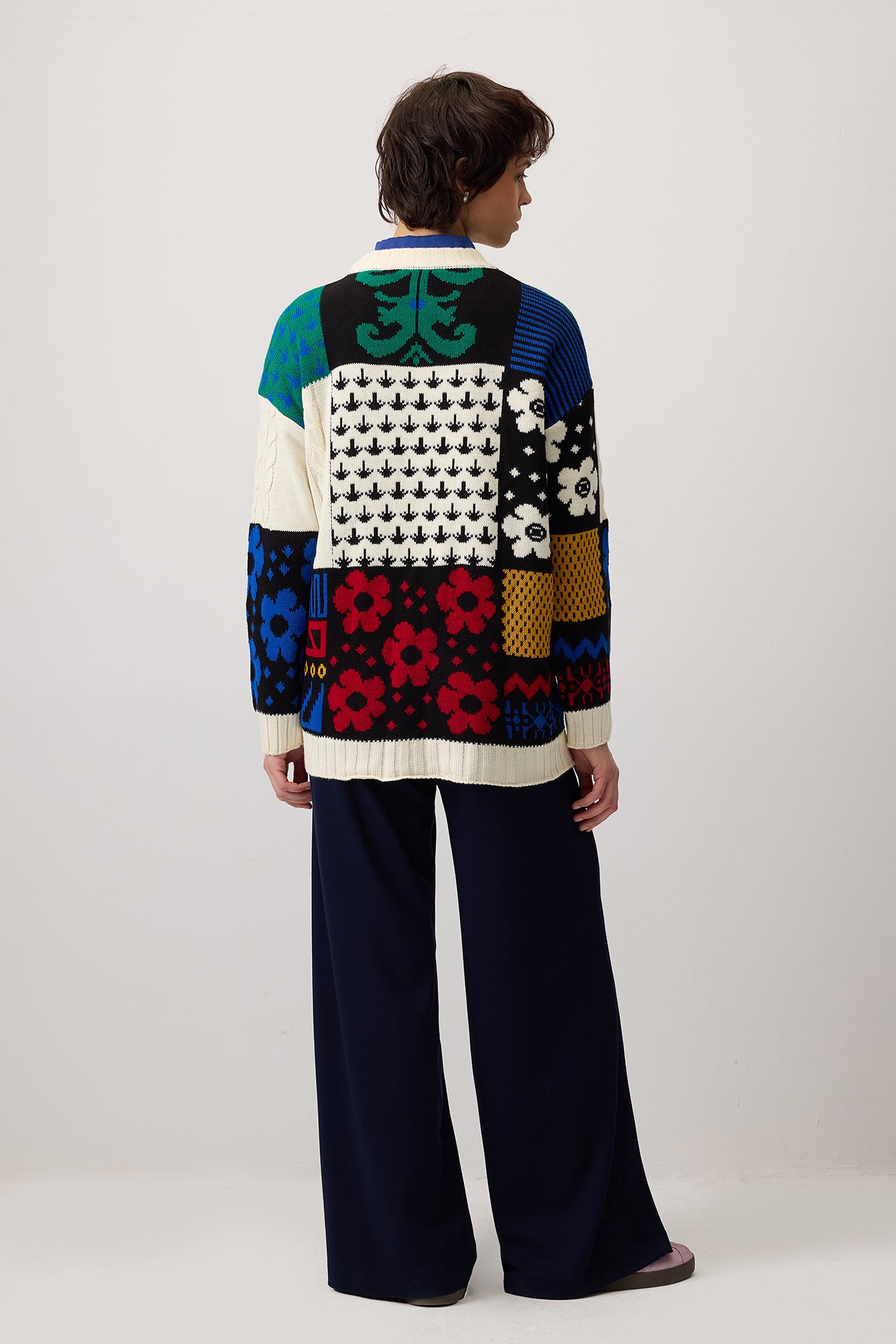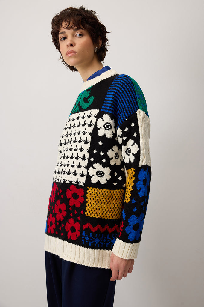 This colorful patterned knit sweater brings vibrancy and fun to your wardrobe. Featuring a patchwork of bold, geometric and floral prints in red, black, green, yellow, and blue, this sweater combines creativity with warmth. The relaxed fit and cozy texture make it ideal for casual days or layering for extra warmth. A true statement piece for anyone looking to add playful energy to their outfit.