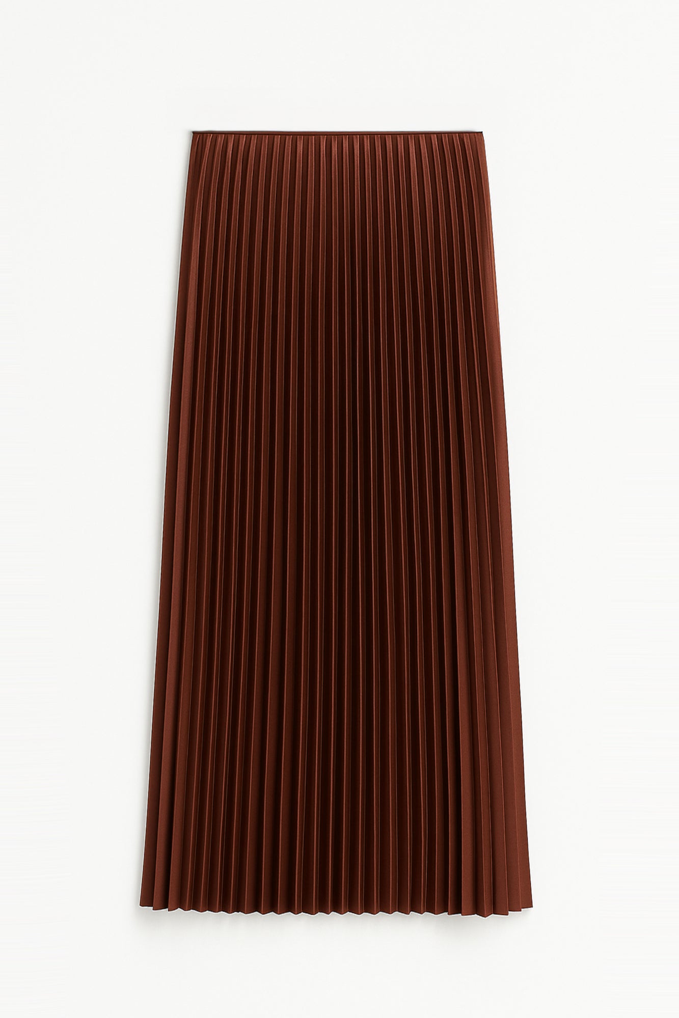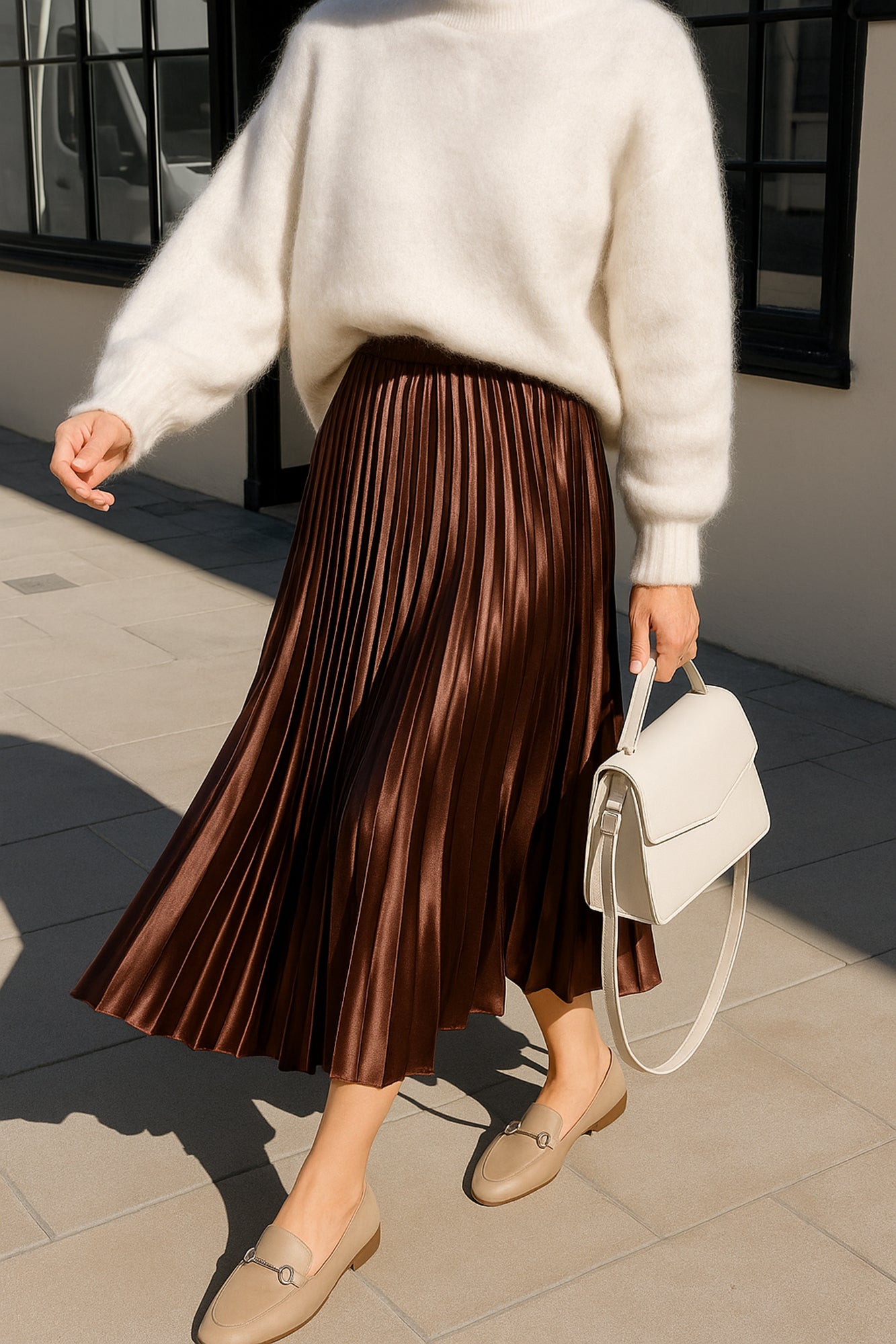 This elegant pleated skirt is a perfect blend of style and comfort. Featuring meticulously crafted pleats that create a fluid, sophisticated silhouette, it offers both movement and structure. The deep brown hue adds a rich touch, making it versatile enough to be dressed up or down for a variety of occasions. Pair it with a simple top or layer it with a jacket for an effortlessly chic look.