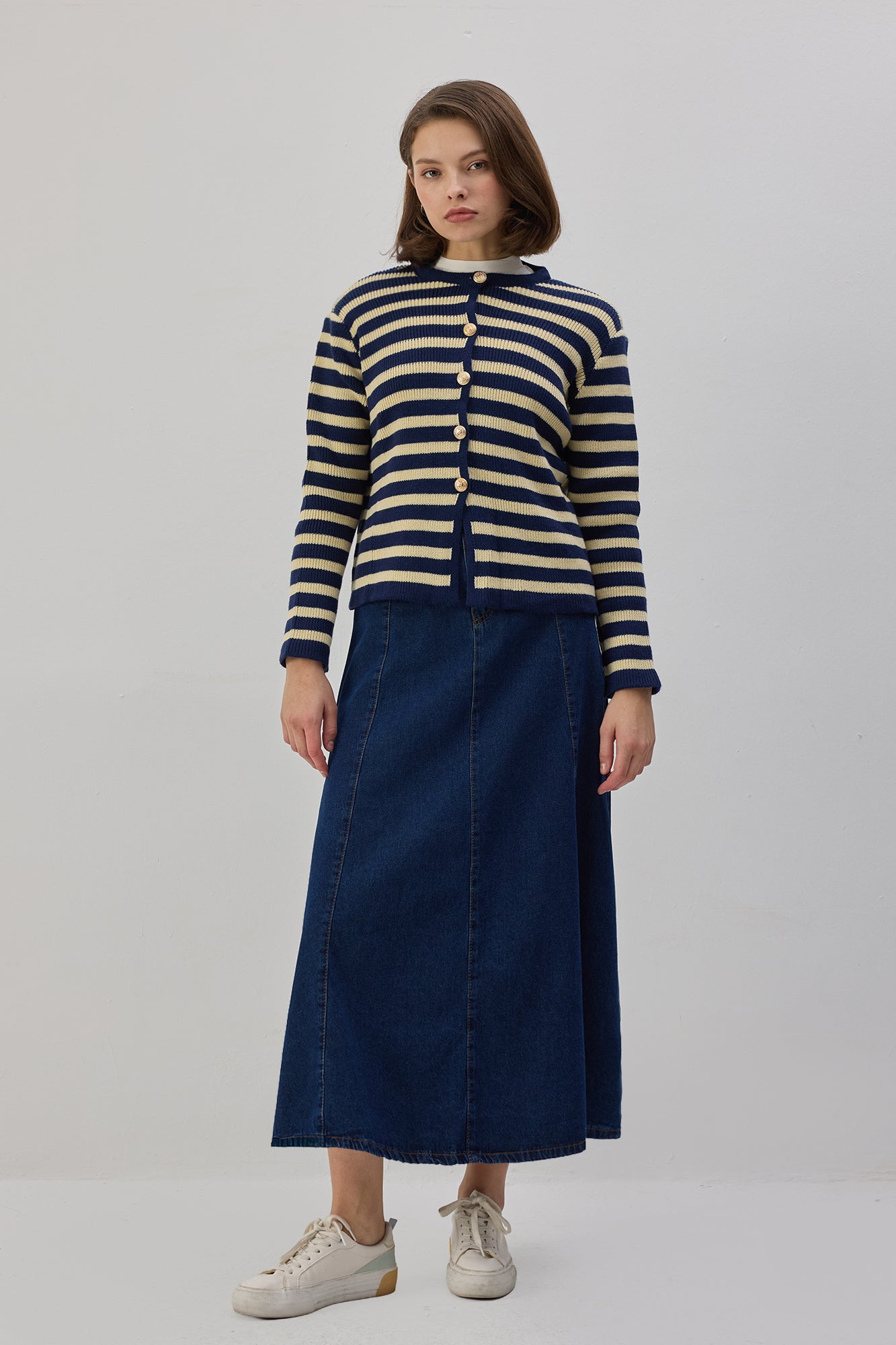 The Striped Short Cardigan with Gold Buttons combines a timeless pattern with elegant details. Its bold black-and-white stripes exude a chic and classic aesthetic, while the gold buttons add a touch of sophistication. The short, structured design ensures a polished look, making it perfect for both casual and semi-formal occasions.