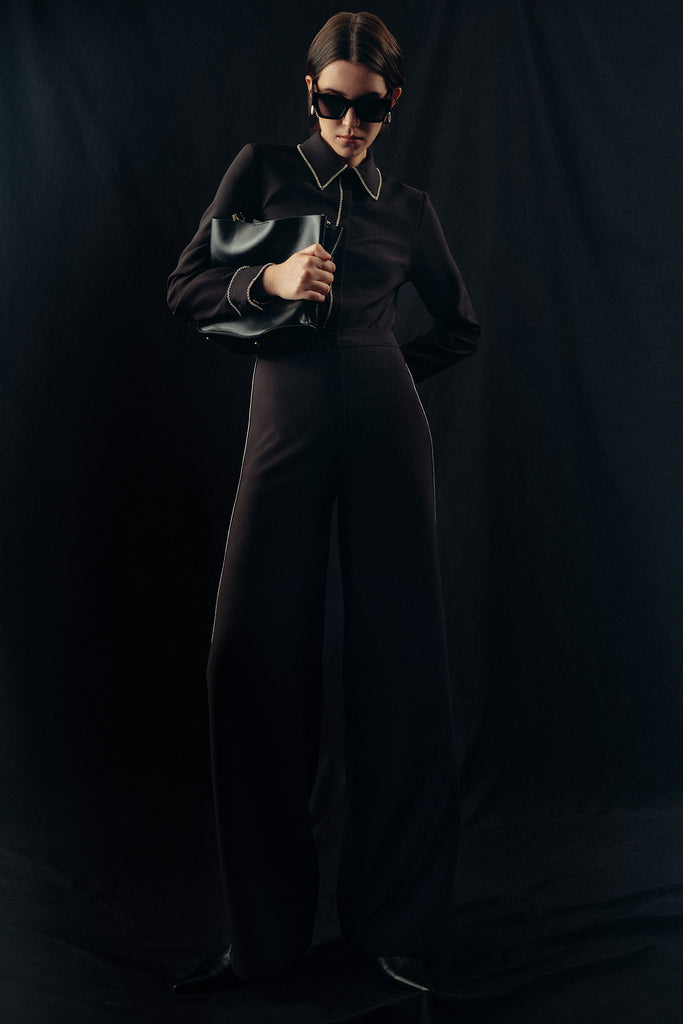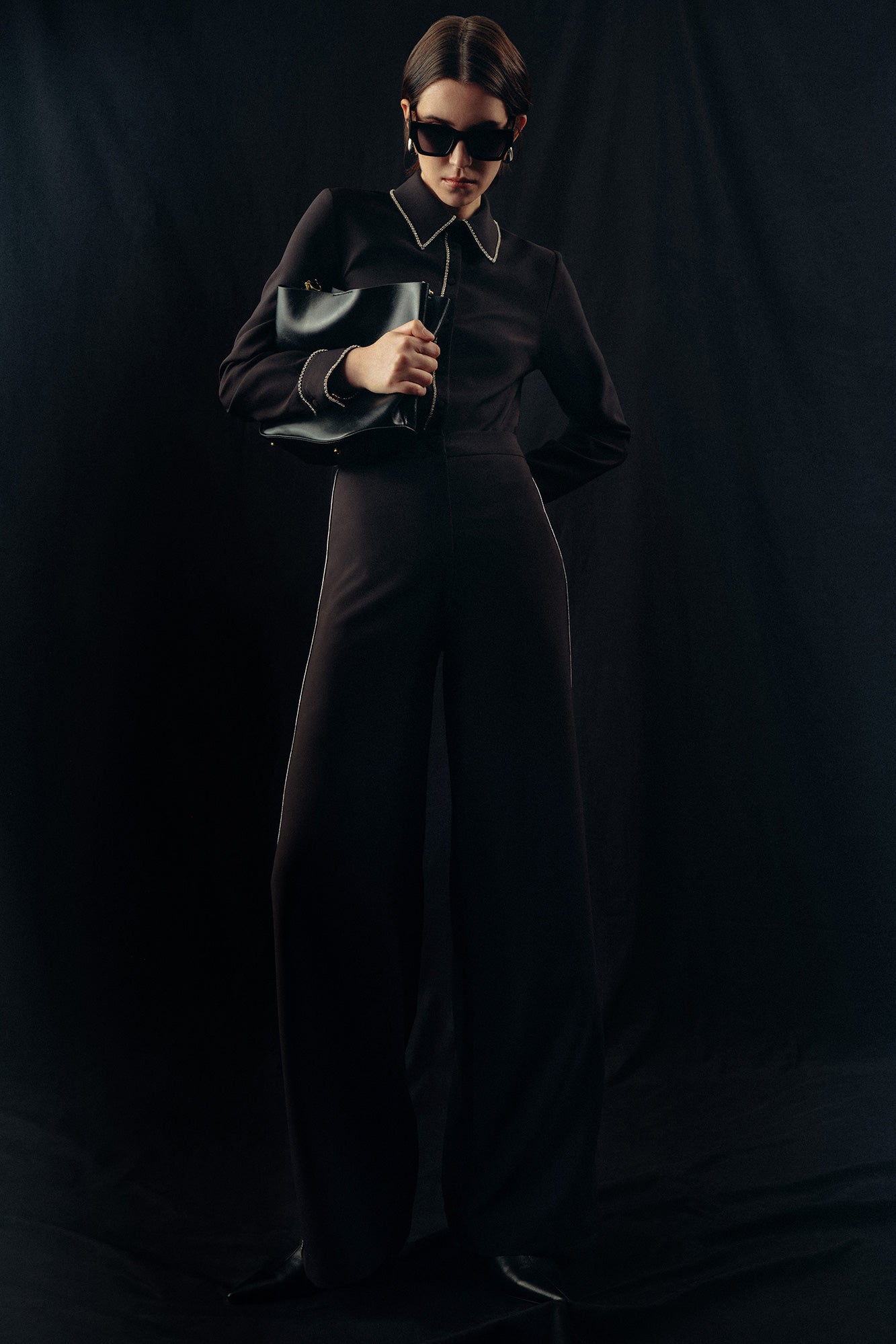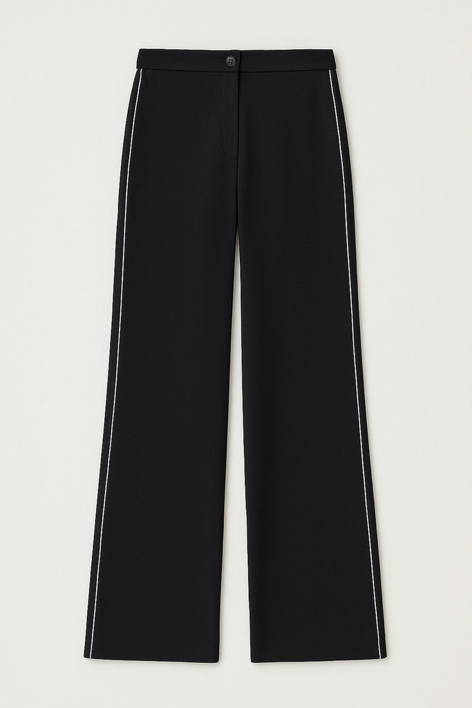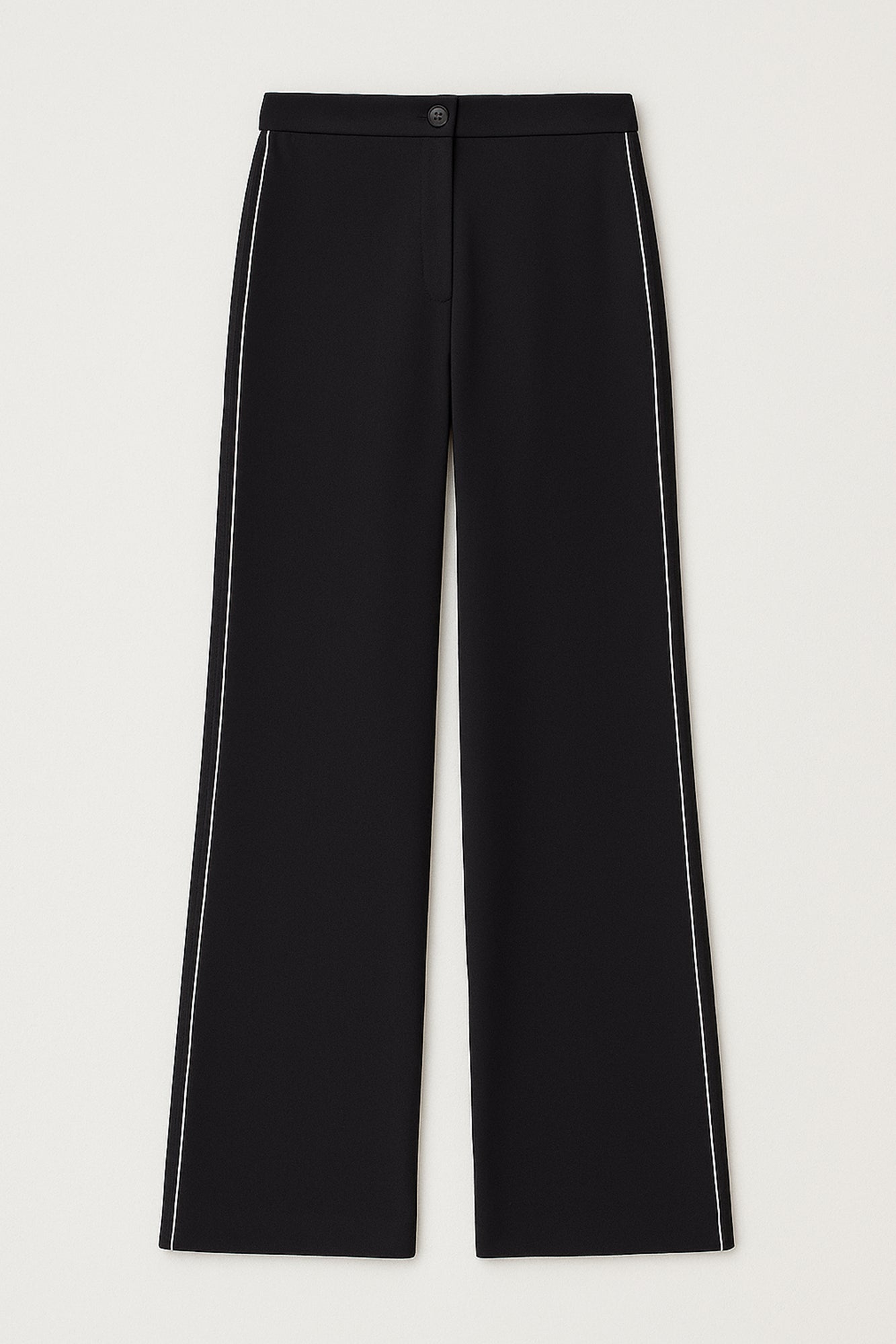 These chic black crepe pants offer a sophisticated and comfortable fit, with a subtle but stylish trim detail along the sides. Designed with a high waist and a tailored wide-leg cut, they provide a flattering silhouette that pairs beautifully with both casual and more formal tops. Whether you're dressing up for a business meeting or dressing down for a relaxed outing, these versatile pants are a wardrobe essential.