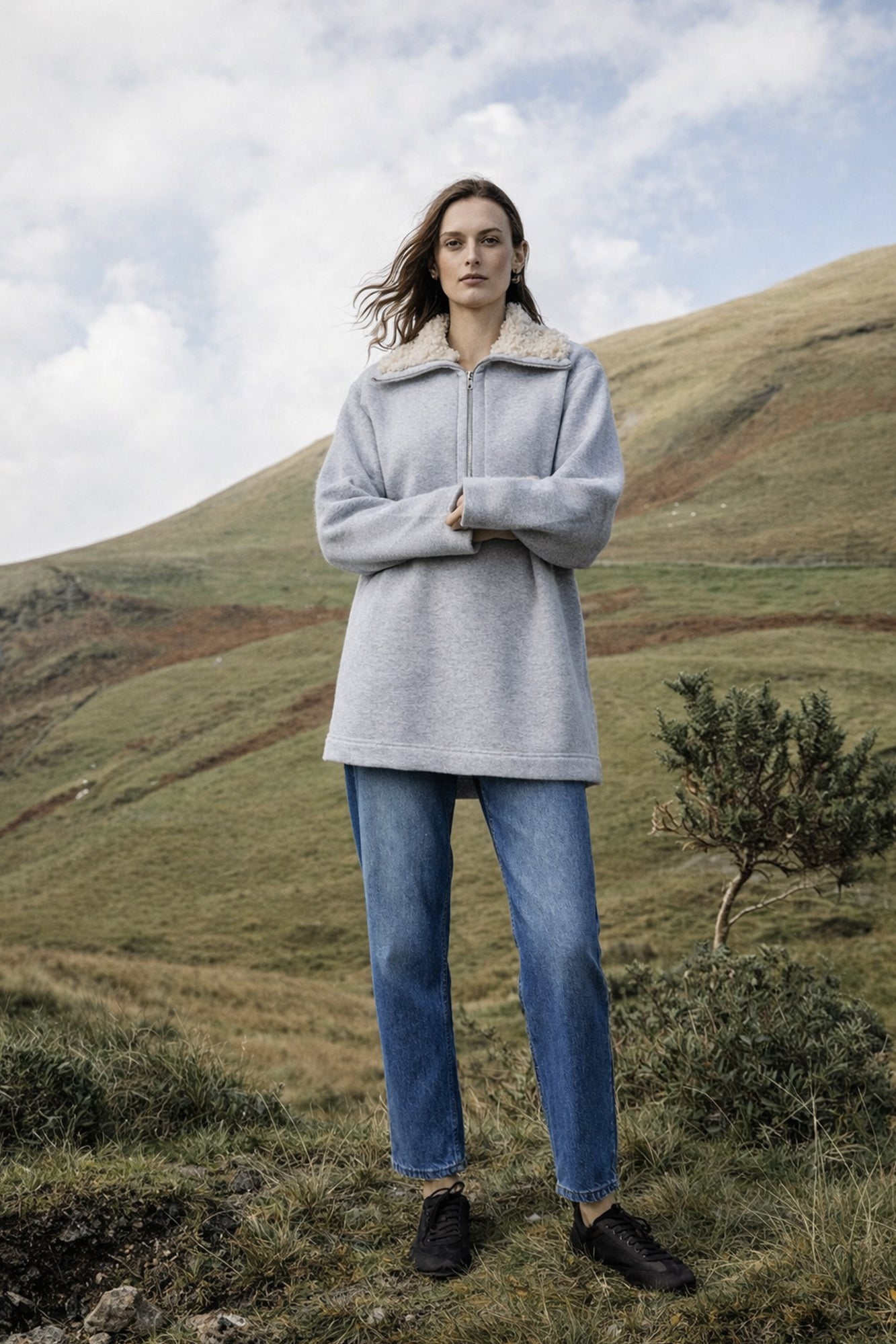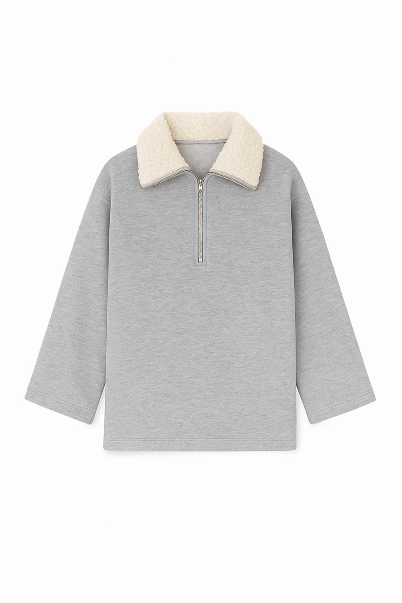 This stylish sweatshirt offers comfort with a modern edge. Featuring a soft faux fur collar that adds warmth and a touch of elegance, it is designed with a half-zip front for a relaxed look. The bell sleeves and casual fit make it perfect for pairing with jeans or leggings for a cozy yet fashionable ensemble.