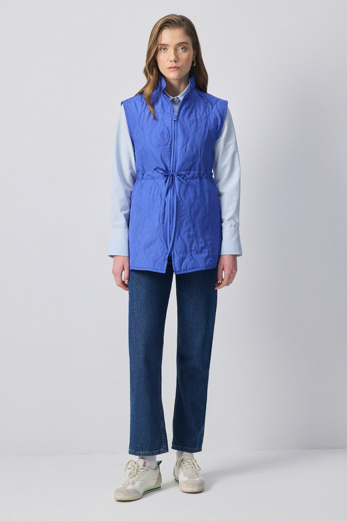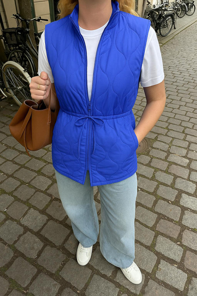 This vibrant zippered quilted vest in a striking blue color offers both comfort and style. Designed with a lightweight quilted fabric, it provides warmth without feeling bulky. The adjustable drawstring waist allows for a more fitted silhouette, making it perfect for layering over shirts or sweaters. Ideal for transitioning between seasons, this vest is a stylish and practical addition to your wardrobe.