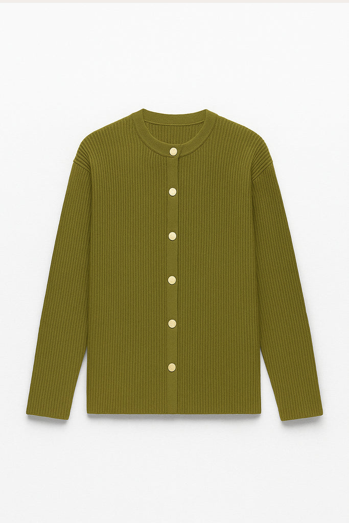 This olive green cardigan features a cozy ribbed knit design that offers both warmth and style. The long silhouette gives a relaxed yet chic vibe, while the large gold buttons down the front add a touch of elegance. Ideal for layering over your favorite outfit, this cardigan is perfect for cooler weather and can be paired with casual or more refined looks.