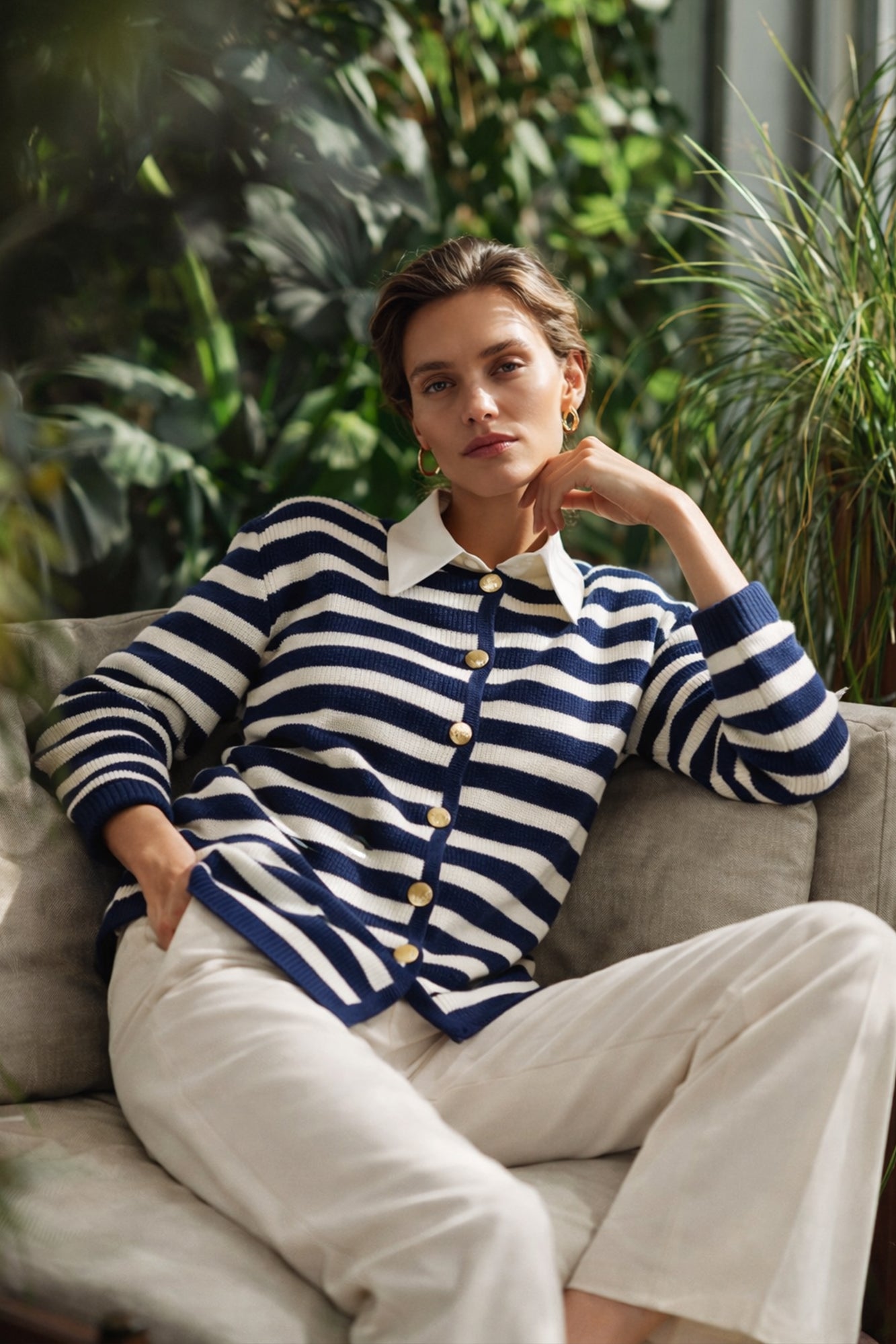 This stylish striped long cardigan combines bold navy and white stripes with elegant gold buttons for a sophisticated look. Featuring a relaxed fit and a classic collar, this piece effortlessly elevates any outfit. Whether layered over a simple t-shirt or worn with a button-up shirt, it's perfect for both casual and dressy occasions, adding a chic touch to your wardrobe.