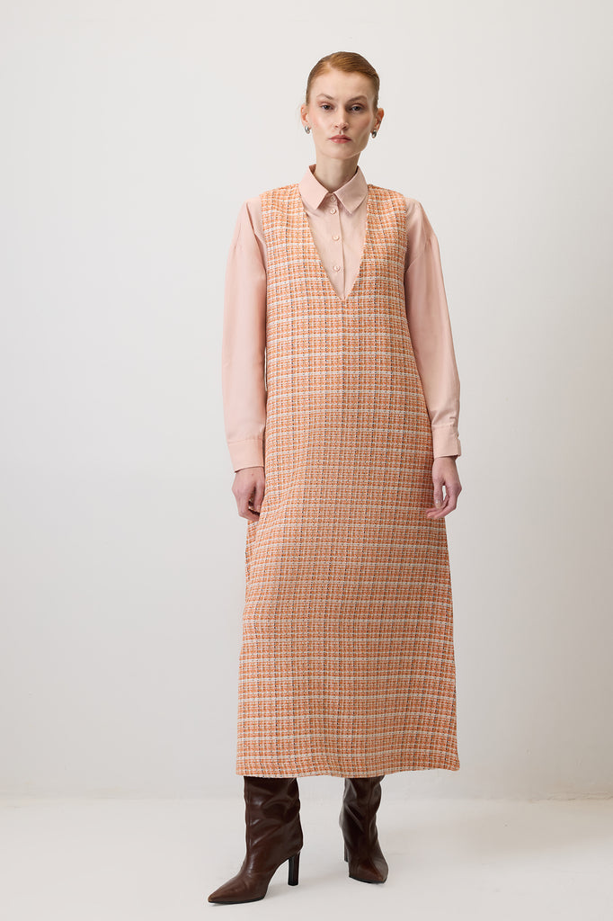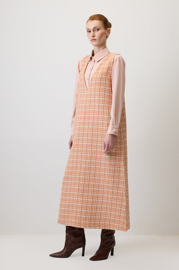 TWEED CHECKED V-NECK PINAFORE DRESS