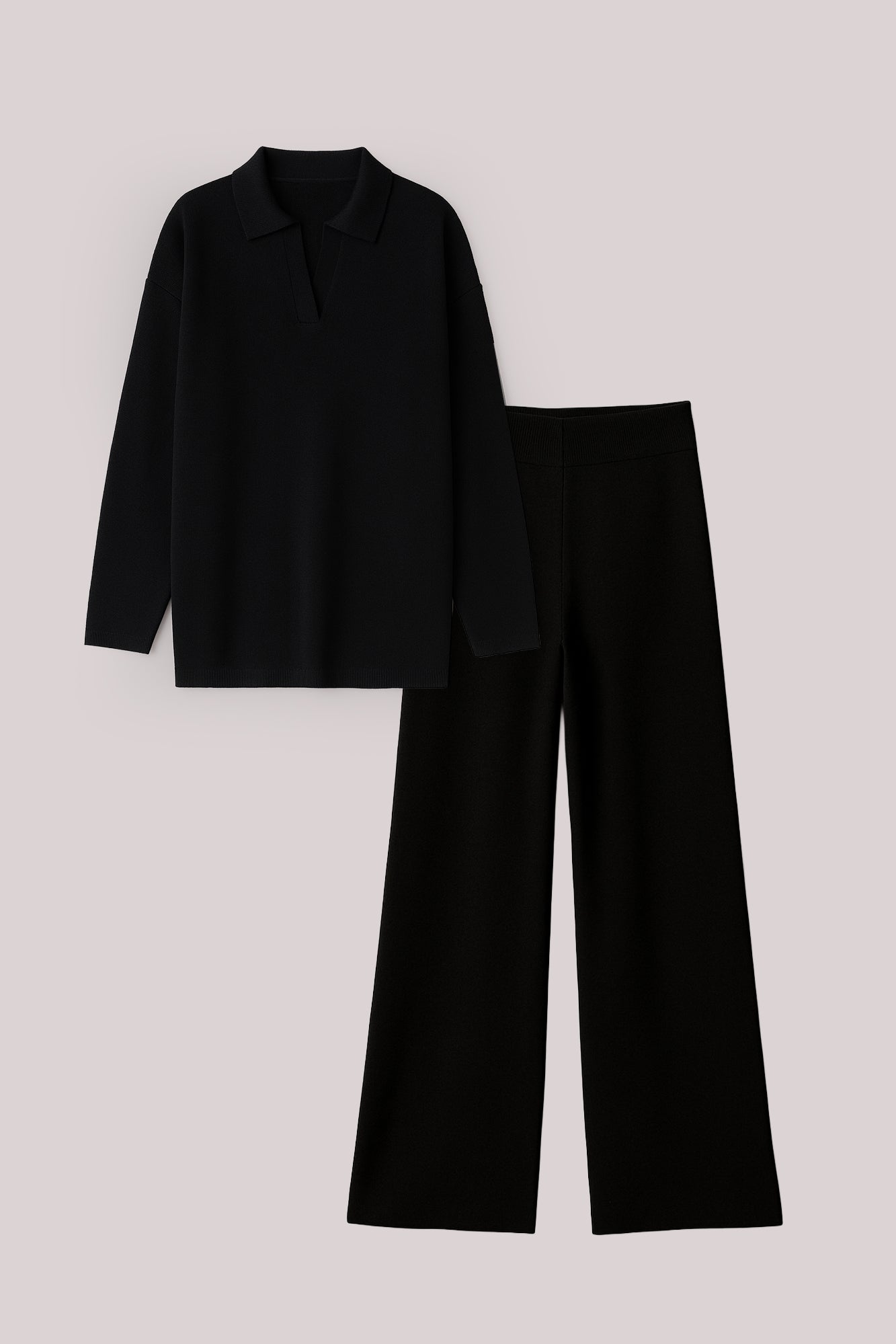 Embrace ultimate comfort and modern style with this knit collar tunic and trouser set. Crafted from soft, breathable fabric, the relaxed silhouette features a stylish collar for a sophisticated touch. Paired with matching wide-leg trousers, this set offers both ease and elegance, perfect for casual days or cozy weekends. The sleek black design makes it versatile and easy to dress up or down.