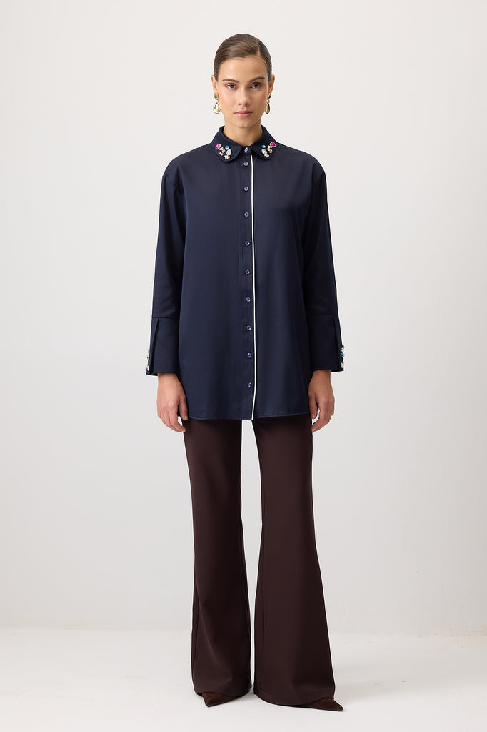 SHOULDER EMBROIDERED DENIM EFFECT SHIRT