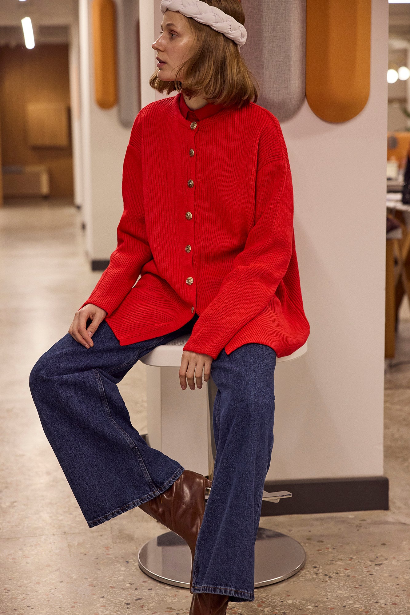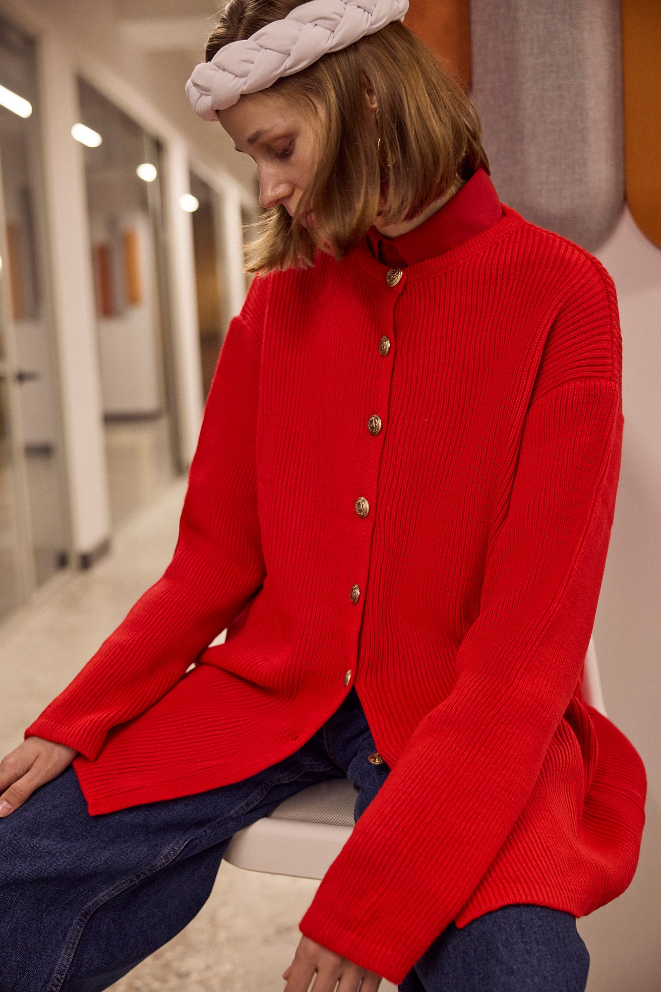 This eye-catching red cardigan combines comfort with style, featuring a soft ribbed texture and a modern, relaxed fit. The chic white collar and elegant gold buttons bring a sophisticated touch, making it the perfect addition to both casual and dressier outfits. Pair it with your favorite trousers or jeans for an effortlessly stylish look.