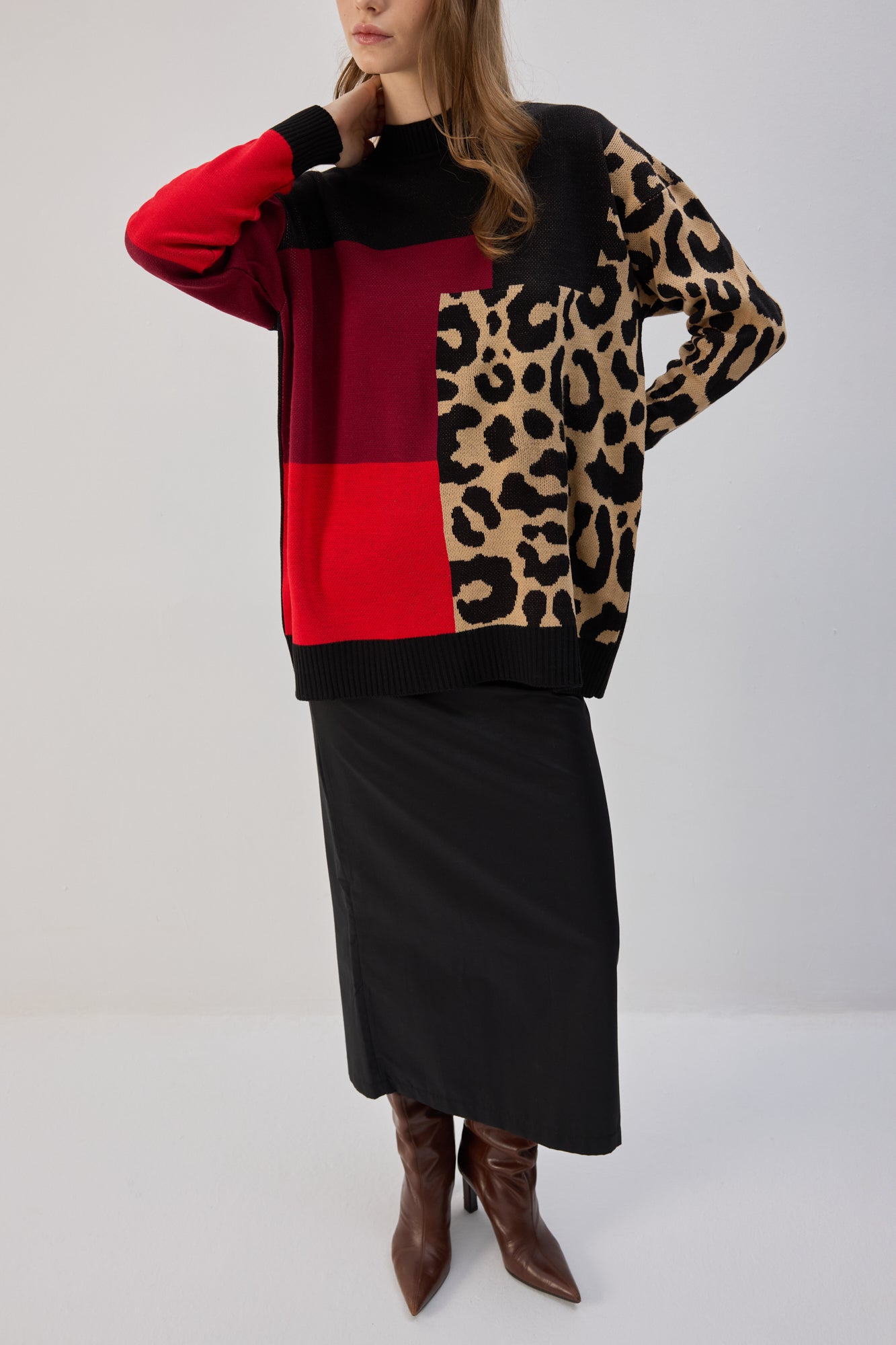 This Leopard Block Patterned Knit Tunic merges bold geometric color blocking with a timeless animal print, creating a chic, modern aesthetic. The tunic features a dynamic combination of burgundy, black, and beige leopard print, offering a striking contrast that grabs attention. The oversized fit provides a relaxed, comfortable silhouette, while the ribbed hems ensure a refined finish.