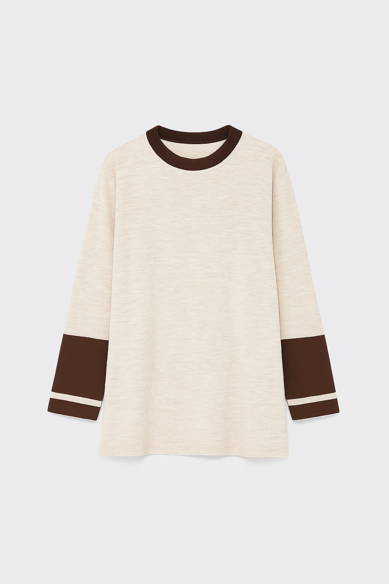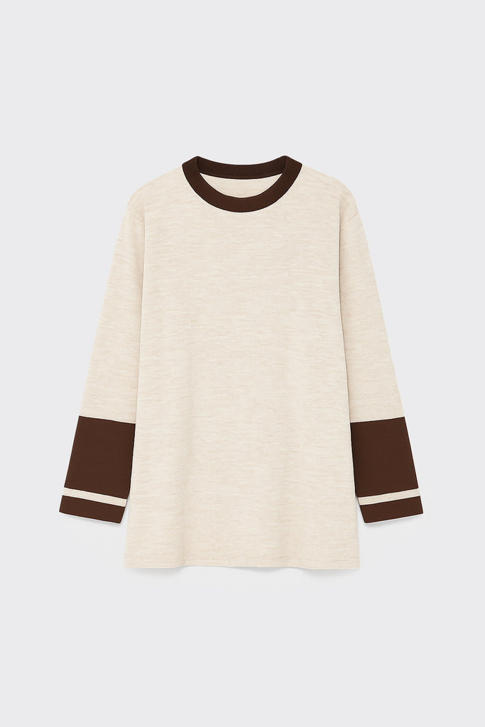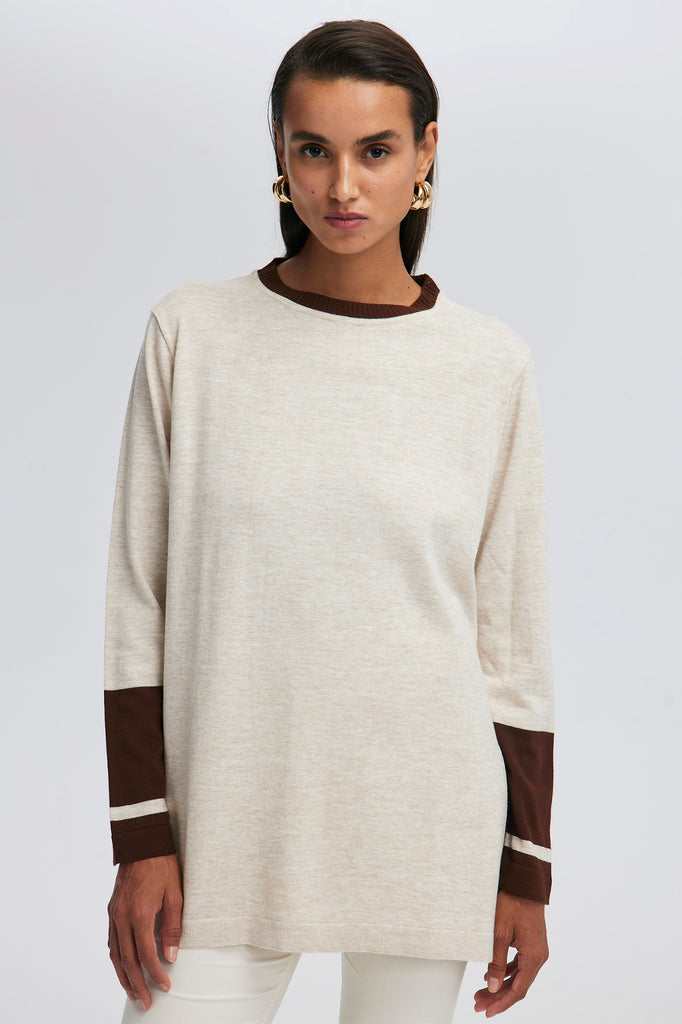 This knit tunic combines style and comfort in a casual yet chic design. Made from a soft fabric, it features a neutral beige base with contrasting brown sleeves, giving it a modern color-block look. The tunic has a relaxed fit with side splits, ensuring ease of movement while maintaining a sleek silhouette. Perfect for layering or wearing alone, this versatile piece can be dressed up or down for a variety of occasions.