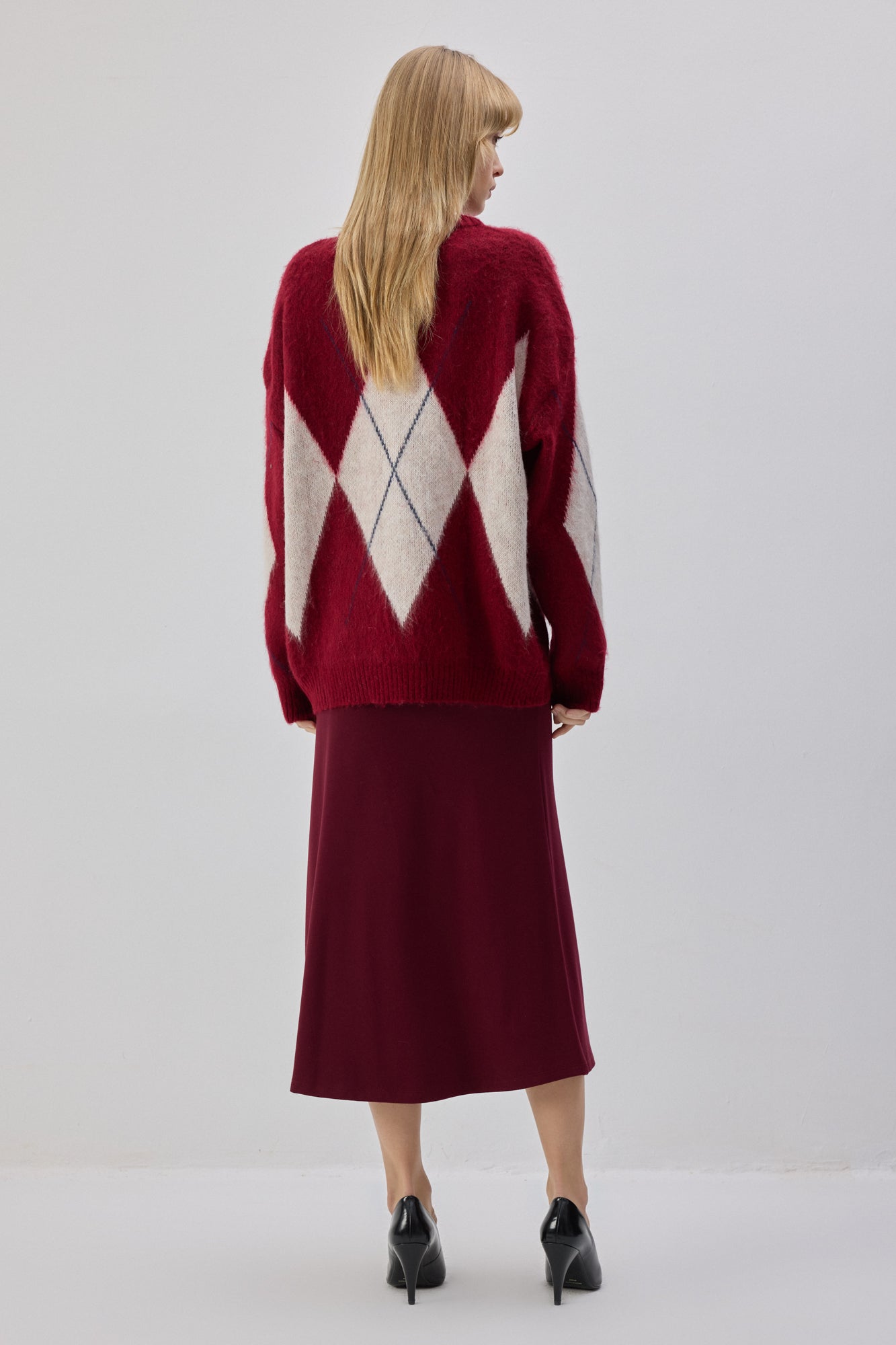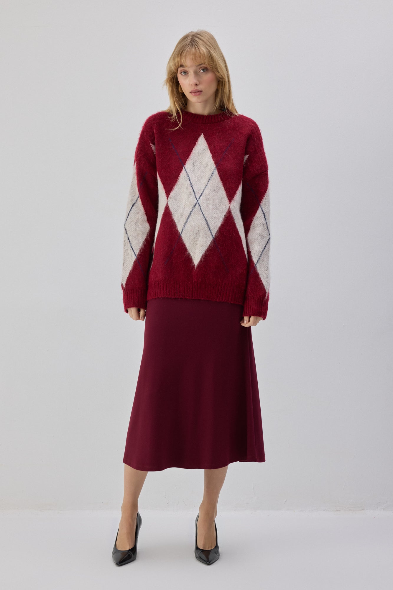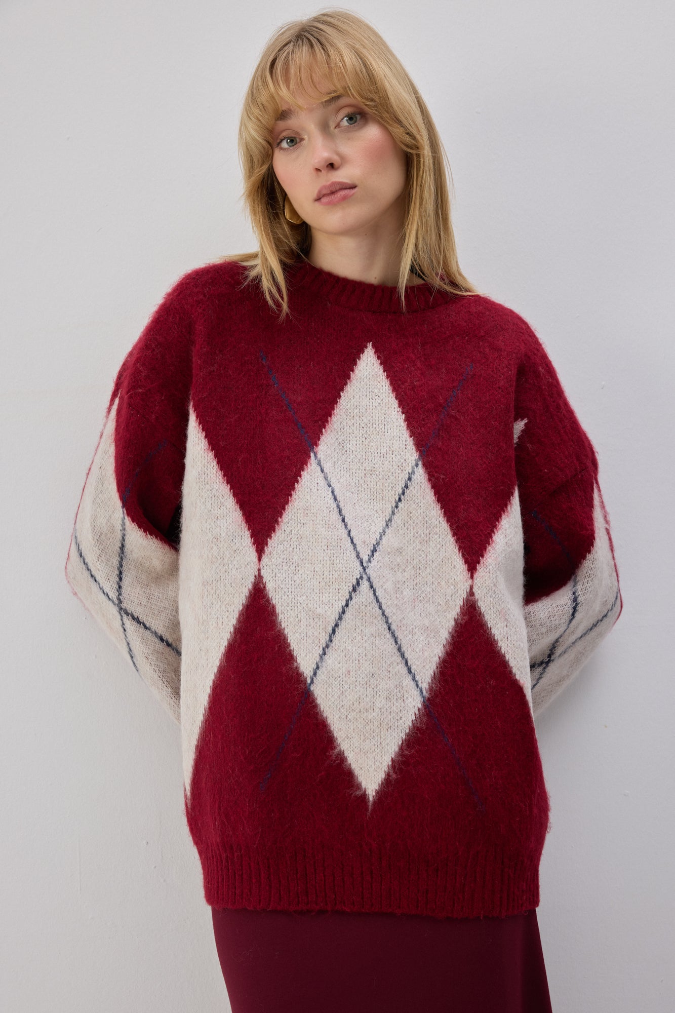 This Diamond Patterned Knit Sweater combines cozy comfort with timeless style. Featuring a bold diamond motif in contrasting colors, this sweater is crafted from a soft knit fabric that ensures warmth and comfort. The relaxed fit and ribbed cuffs make it a versatile piece, perfect for pairing with jeans or tailored trousers for a chic winter look.