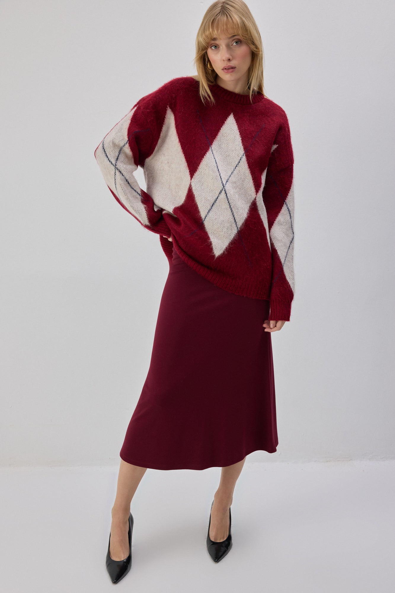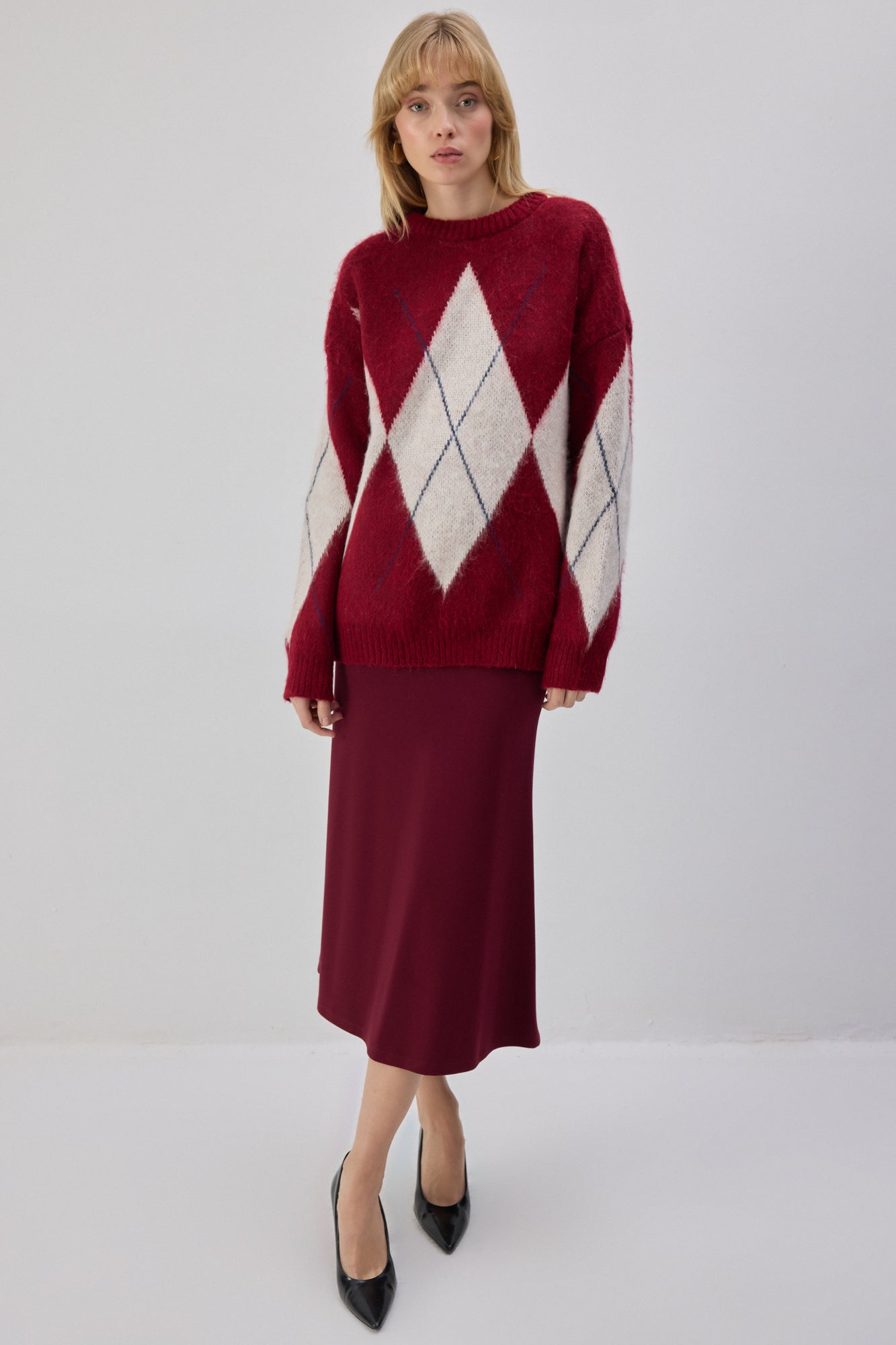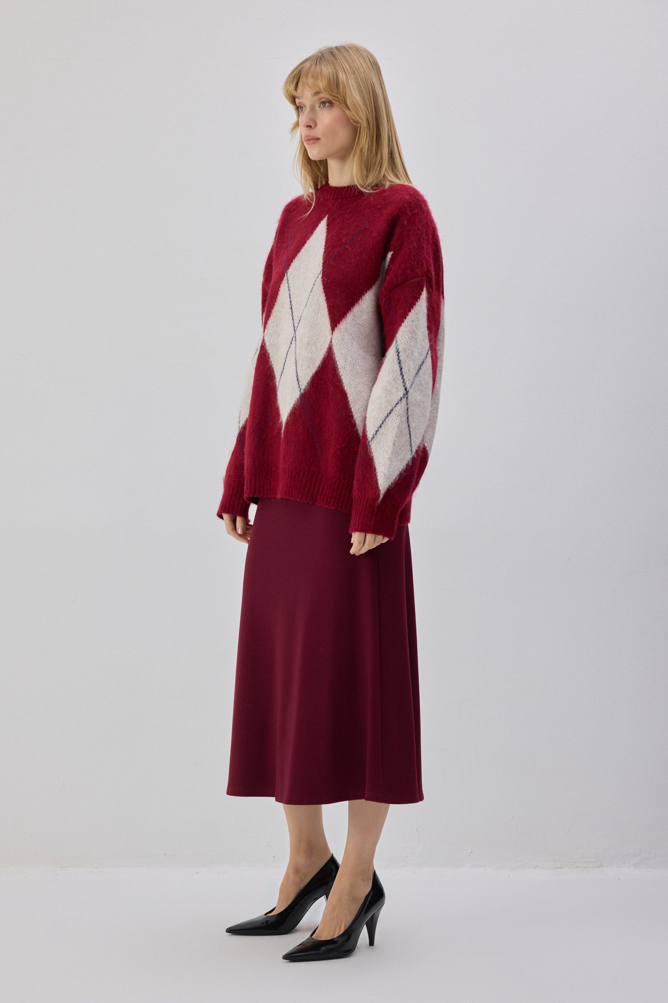 This Diamond Patterned Knit Sweater combines cozy comfort with timeless style. Featuring a bold diamond motif in contrasting colors, this sweater is crafted from a soft knit fabric that ensures warmth and comfort. The relaxed fit and ribbed cuffs make it a versatile piece, perfect for pairing with jeans or tailored trousers for a chic winter look.