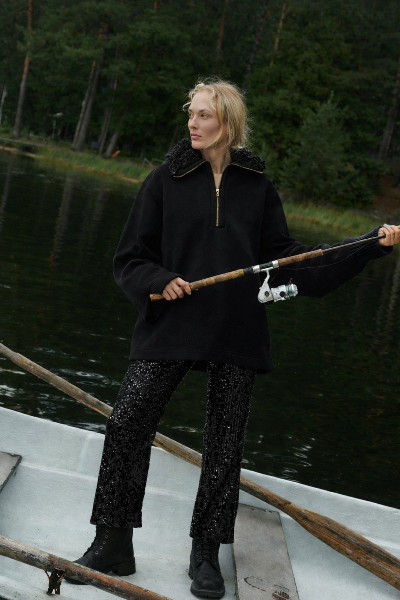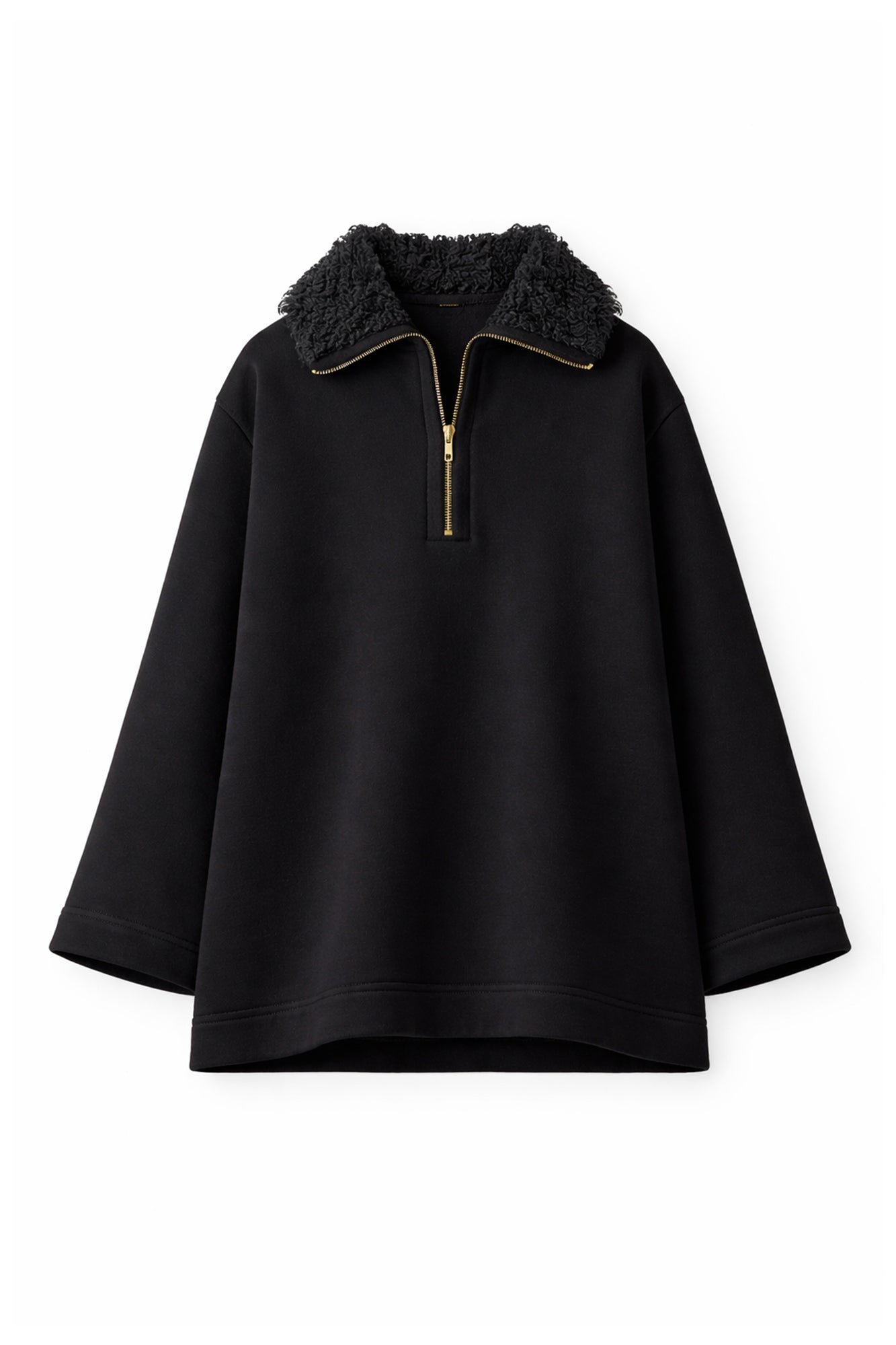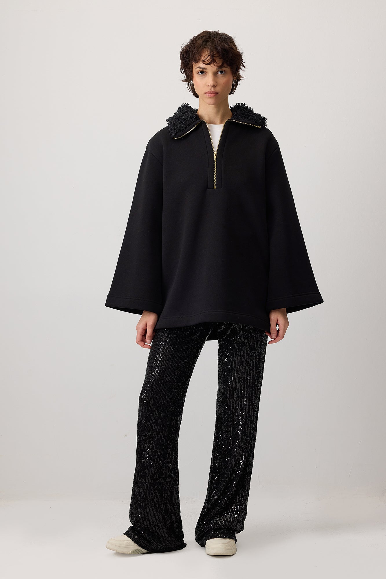 The Faux Fur Collar Sweatshirt brings a touch of elegance to casualwear with its luxurious faux fur collar detail and gold zipper accent. Its relaxed silhouette and flared sleeves make it a comfortable yet stylish choice for cooler days. Perfectly paired with split-hem trousers and heeled boots for a chic, modern look, or with leggings for a cozy, laid-back outfit. Made in Türkiye.