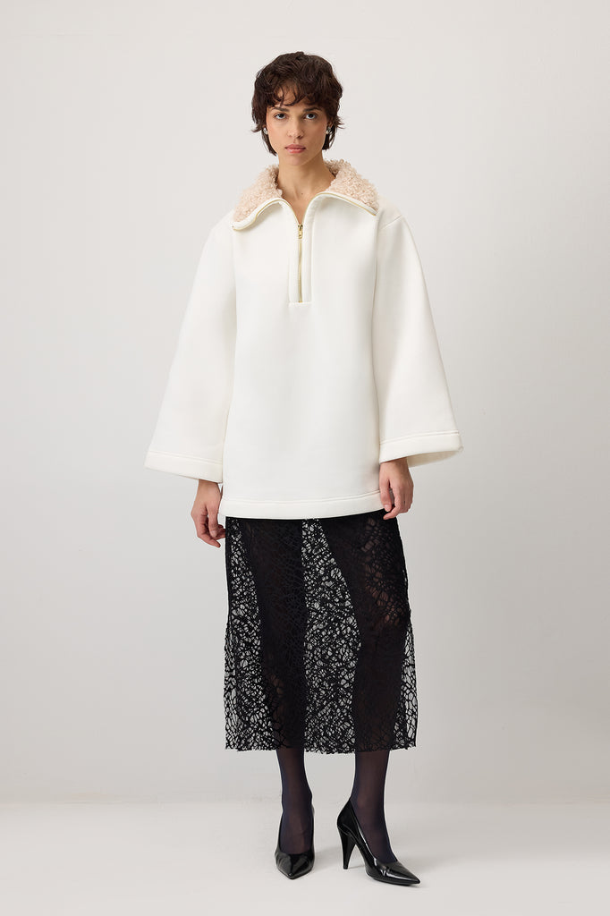 This cozy sweatshirt is perfect for the colder months, featuring a plush faux fur collar that adds a touch of luxury. The half-zip design provides easy styling and comfort, while the relaxed fit and soft fabric make it ideal for everyday wear. Paired with coordinating trousers, this sweatshirt offers a chic, casual look for laid-back outings or cozy indoor days.