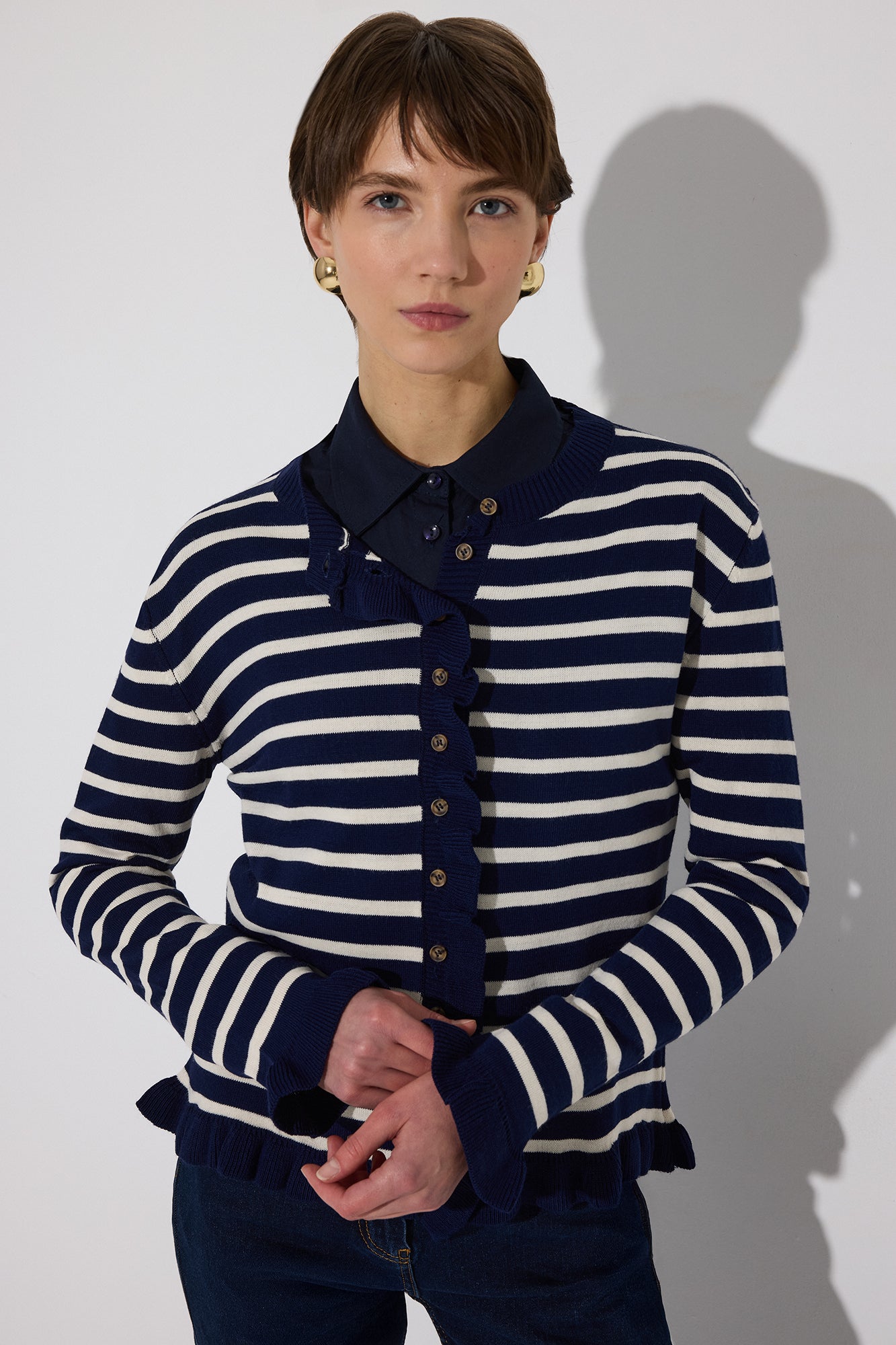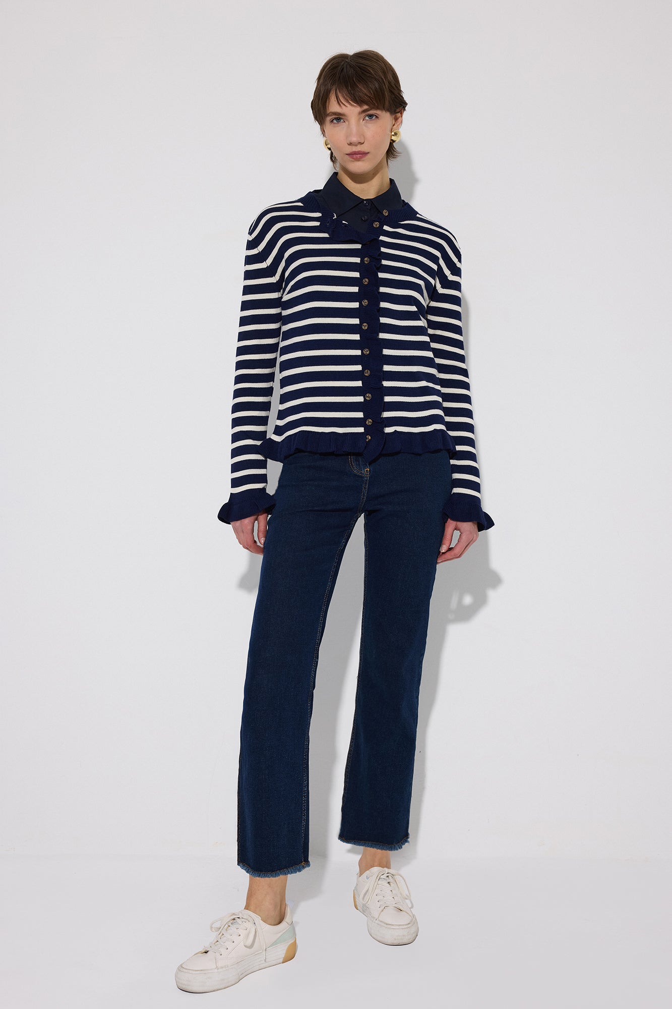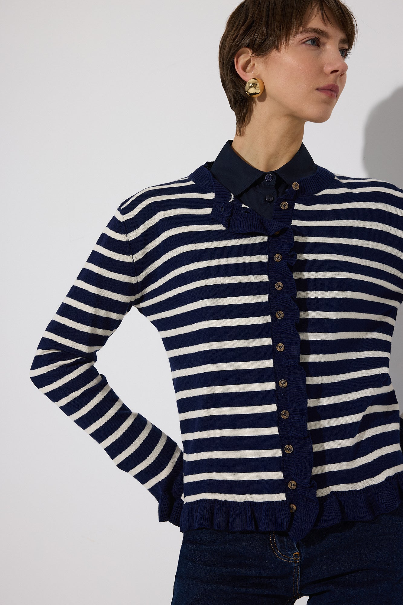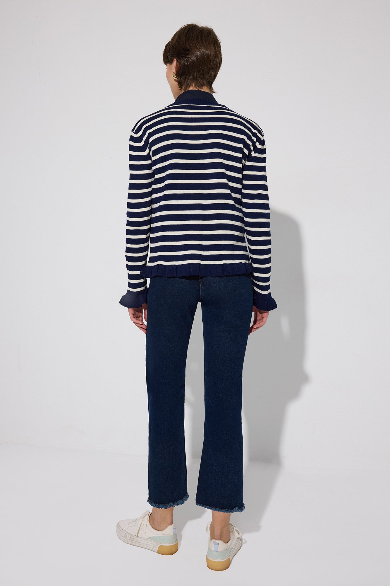 RUFFLED STRIPED KNIT CARDIGAN