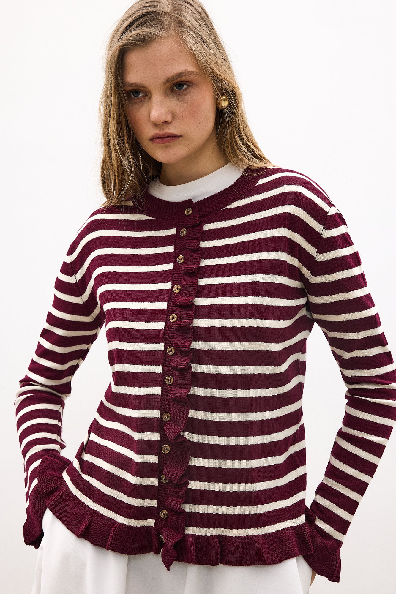 RUFFLED STRIPED KNIT CARDIGAN