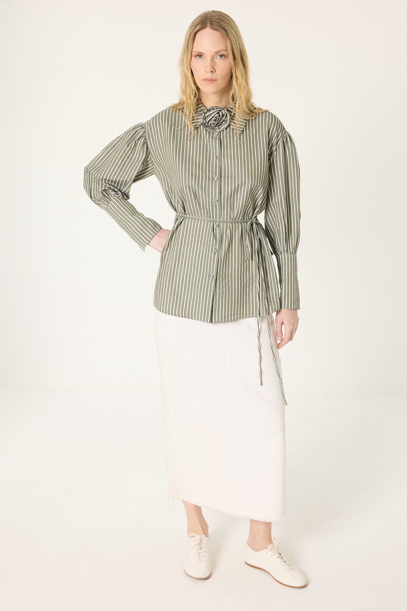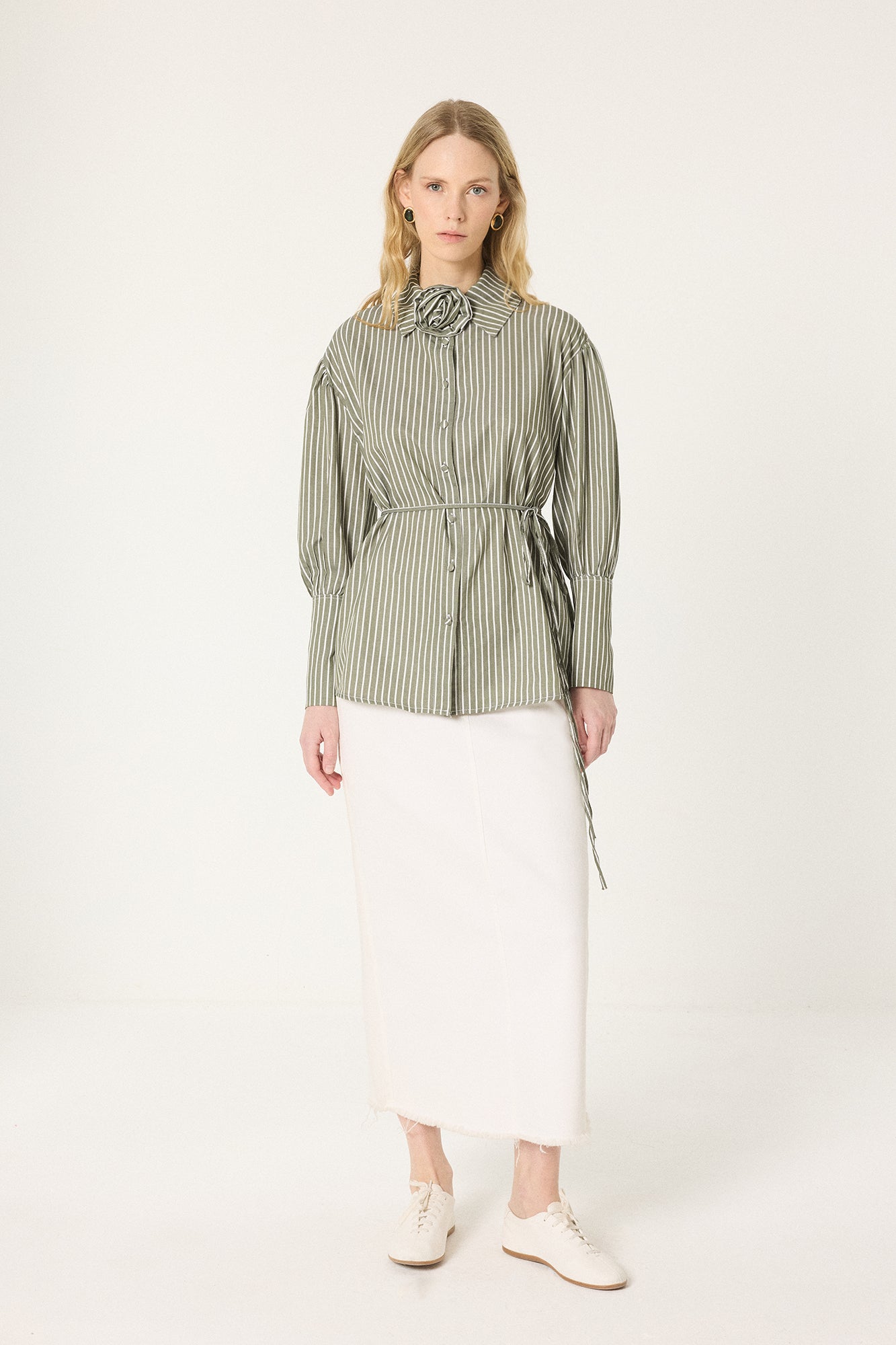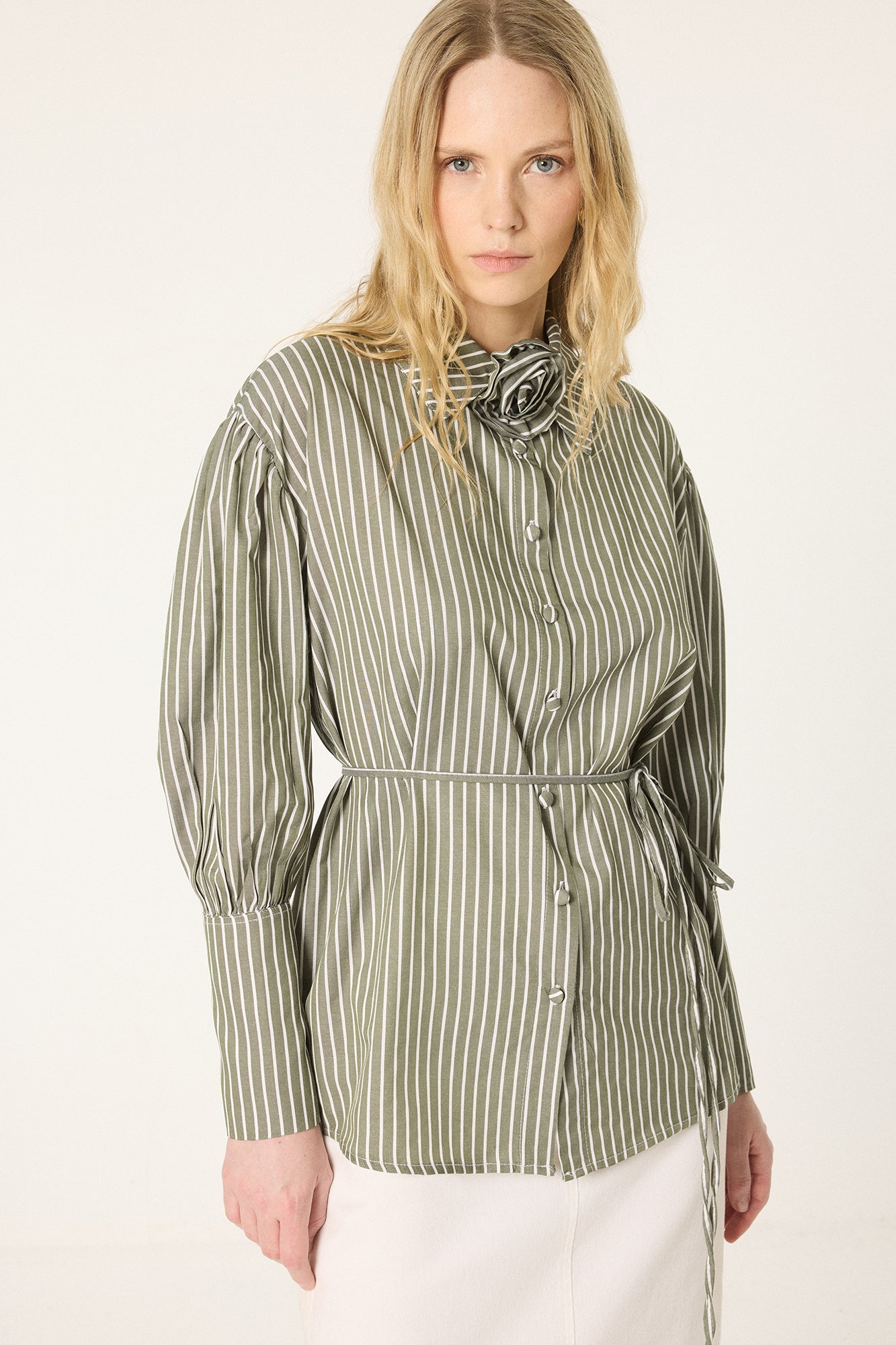 GÜL DETAYLI ÇİZGİLİ GÖMLEK