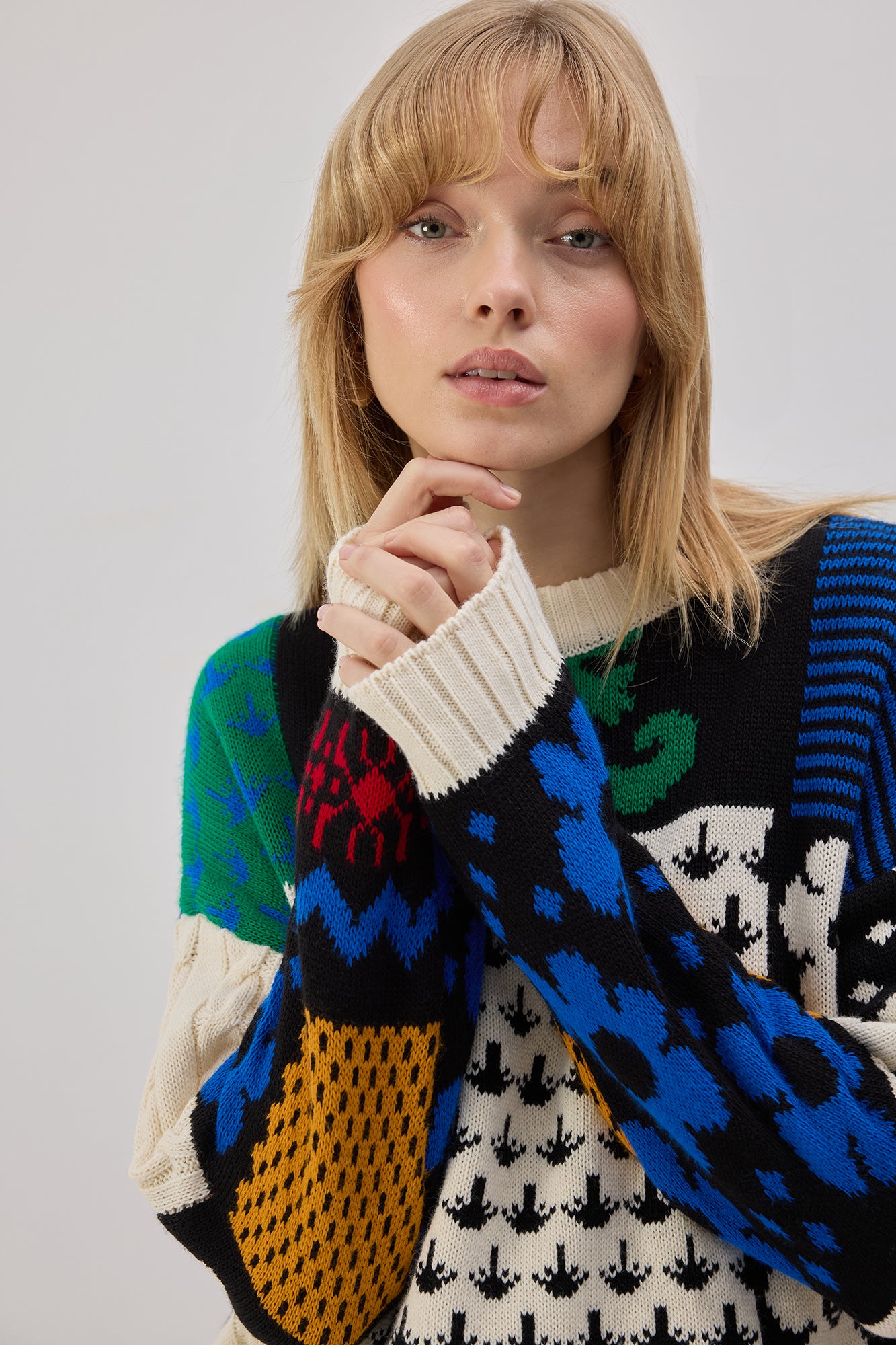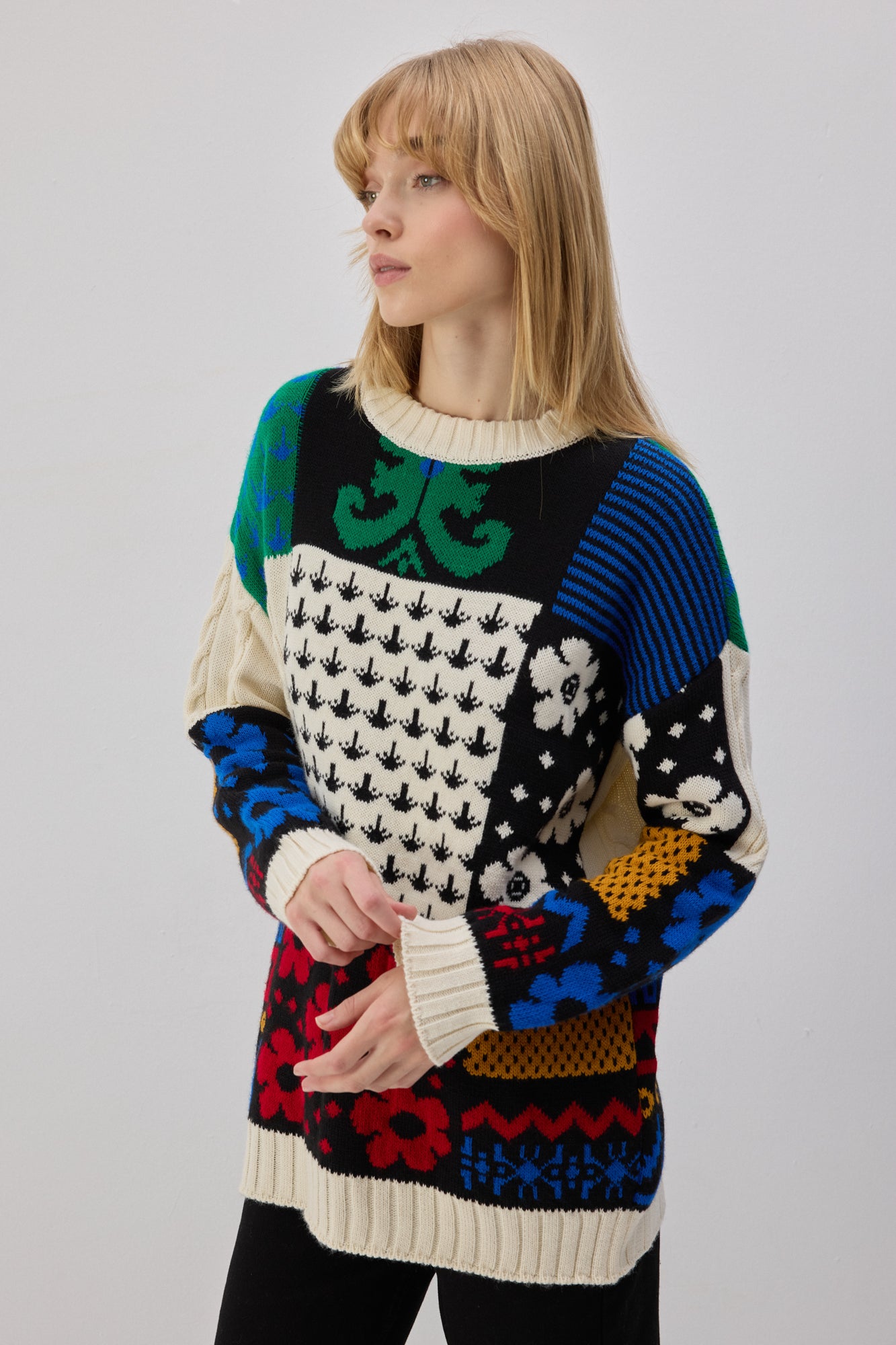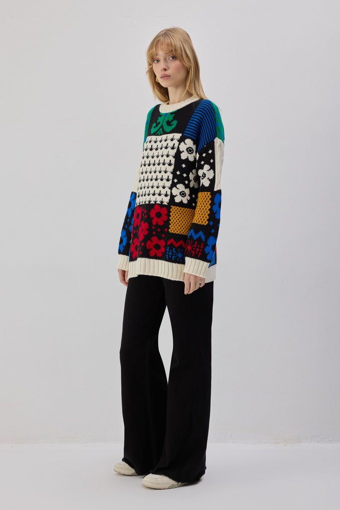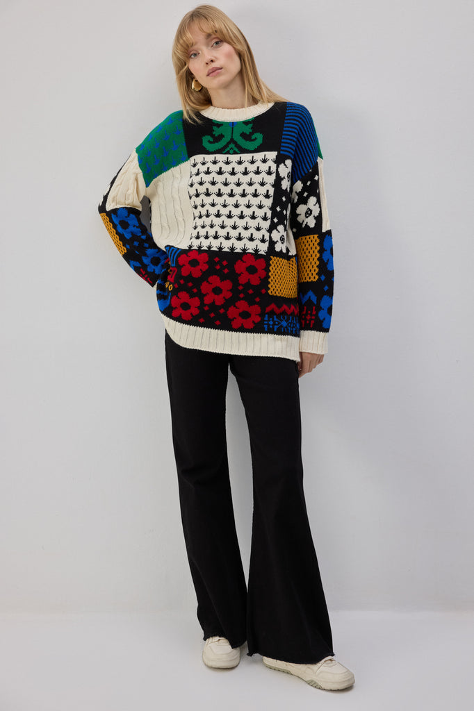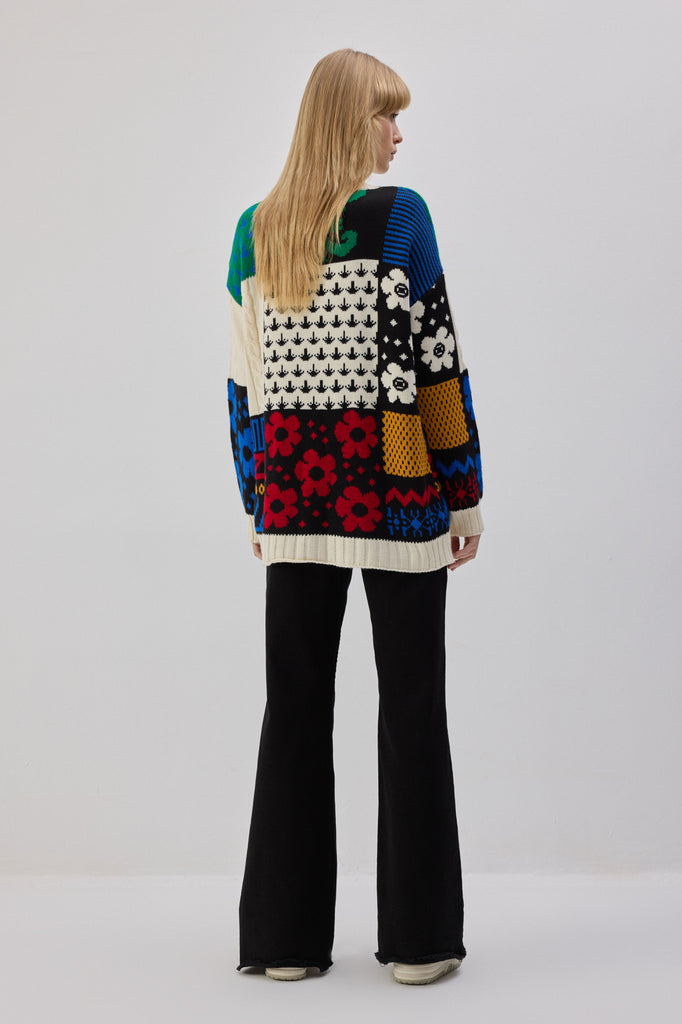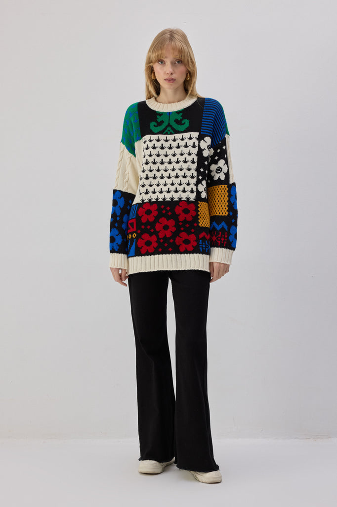 This colorful patterned knit sweater brings vibrancy and fun to your wardrobe. Featuring a patchwork of bold, geometric and floral prints in red, black, green, yellow, and blue, this sweater combines creativity with warmth. The relaxed fit and cozy texture make it ideal for casual days or layering for extra warmth. A true statement piece for anyone looking to add playful energy to their outfit.