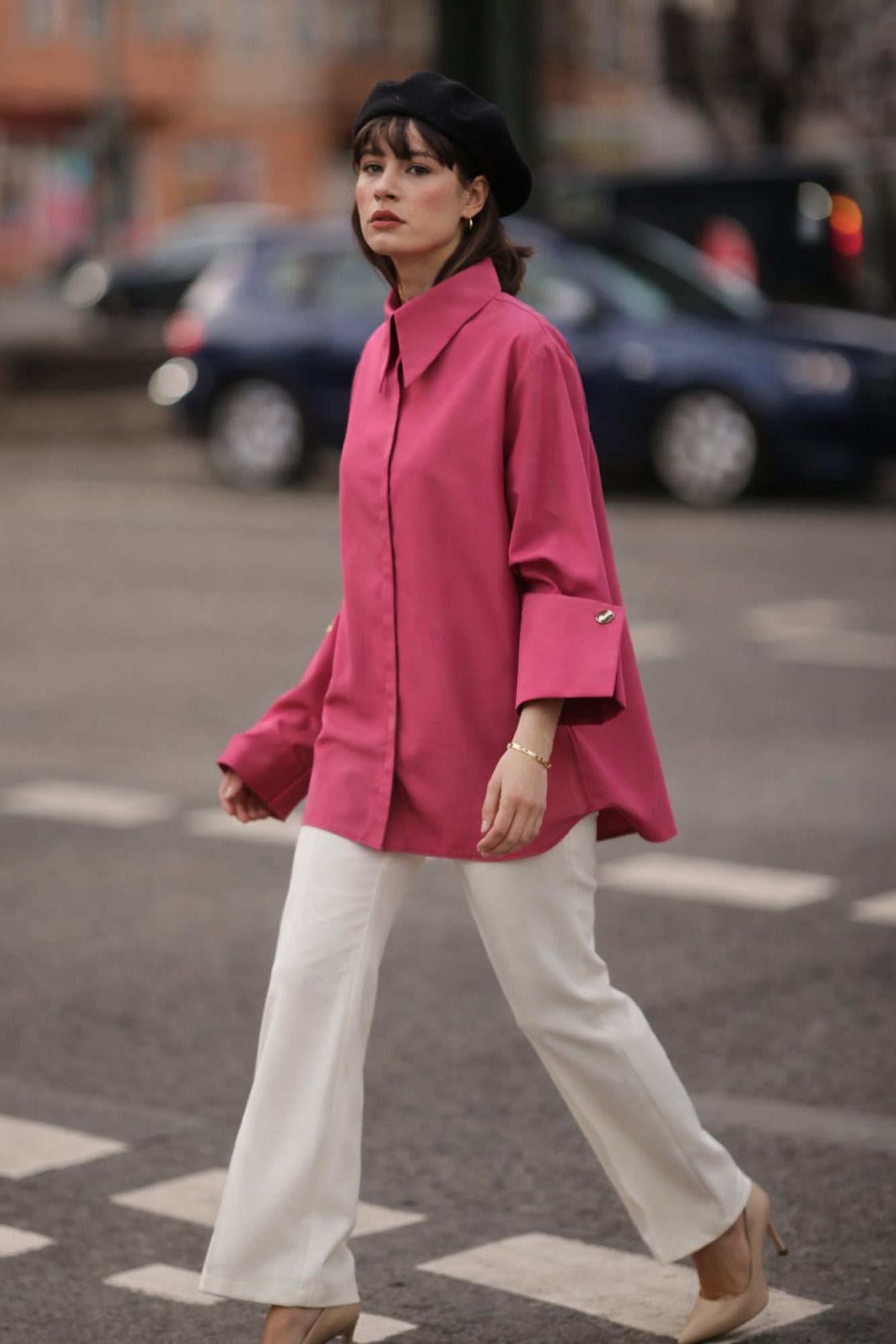 This elegant poplin shirt is designed with a modern twist, featuring wide cuffs and a sleek, minimalistic silhouette. The rich pink color adds a bold touch, while the structured fit and high-quality fabric ensure a sophisticated, polished look. Perfect for both professional and casual settings, the wide cuff detail elevates this classic style, making it a versatile addition to your wardrobe.