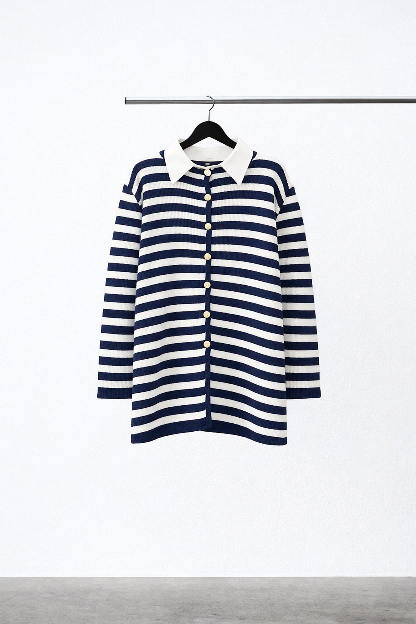 This stylish striped long cardigan combines bold navy and white stripes with elegant gold buttons for a sophisticated look. Featuring a relaxed fit and a classic collar, this piece effortlessly elevates any outfit. Whether layered over a simple t-shirt or worn with a button-up shirt, it's perfect for both casual and dressy occasions, adding a chic touch to your wardrobe.