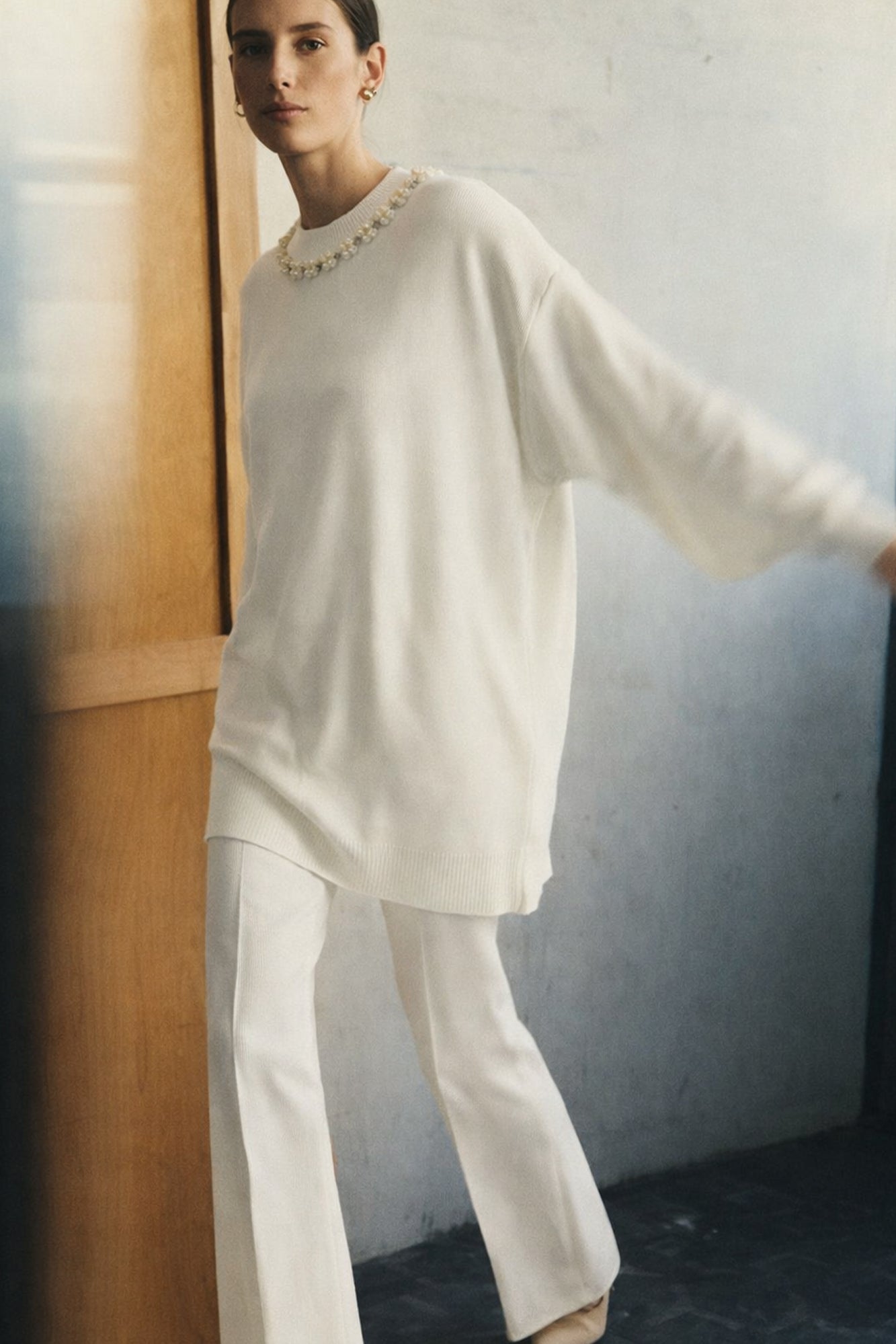 The Sweater with Pearl Collar combines a minimalist design with a touch of elegance. Made from a soft knit fabric, it offers comfort and warmth while maintaining a sophisticated look. The pearl-embellished collar adds a refined detail, elevating this piece from casual to chic.