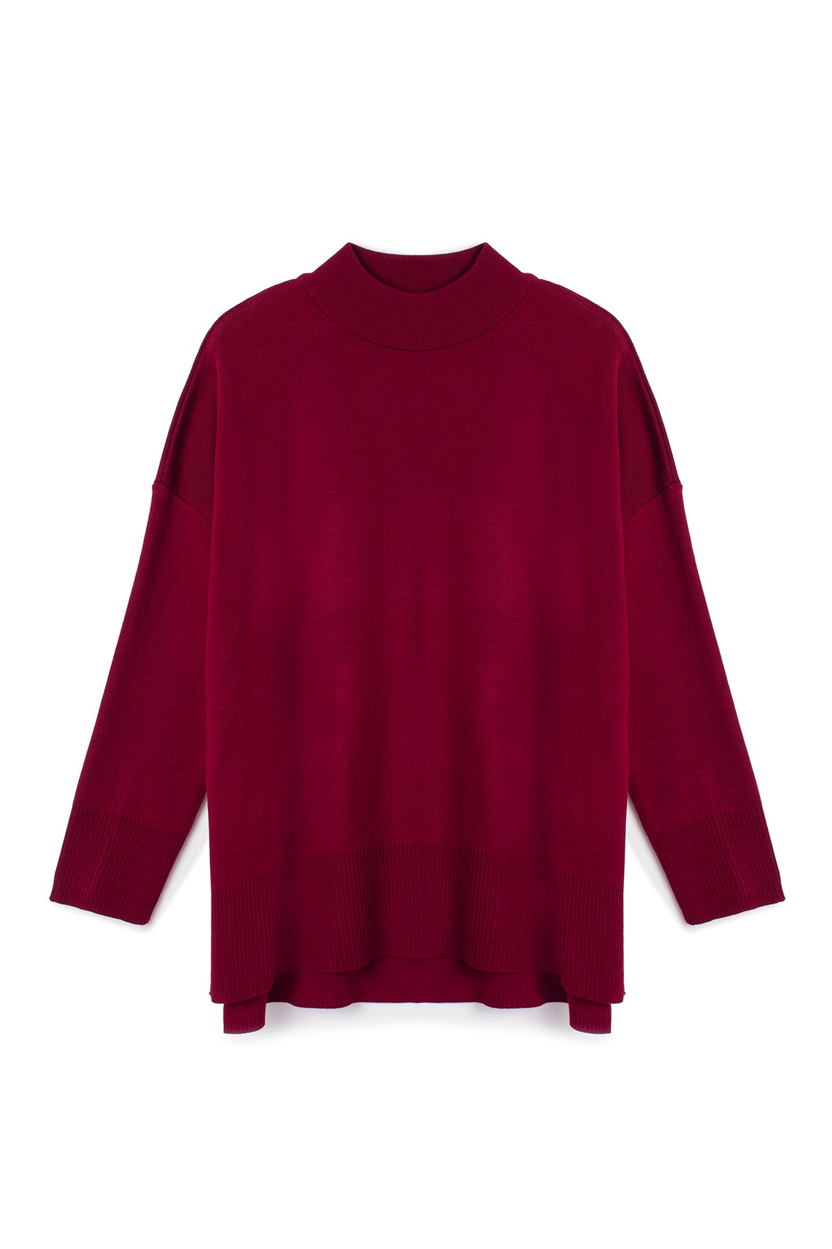 This essential knit sweater features a cozy turtleneck design, perfect for keeping warm in style. The rich burgundy color adds a bold yet sophisticated touch to your wardrobe, while the relaxed fit ensures comfort throughout the day. A versatile piece, ideal for layering over your favorite outfits or wearing on its own for a chic, simple look.