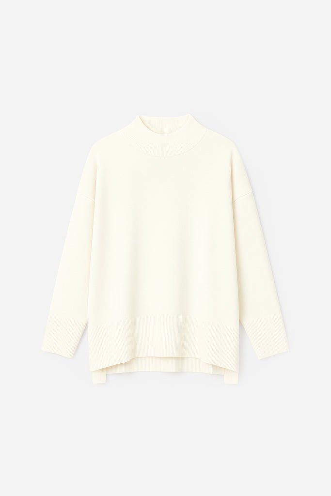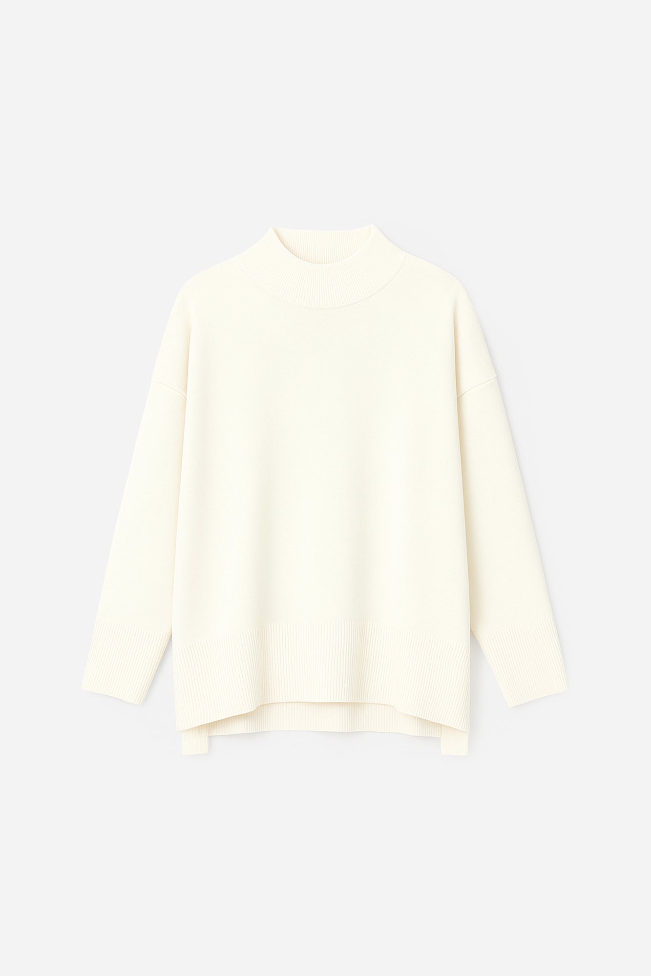 This cozy and elegant turtleneck basic knit sweater features a relaxed fit, making it an essential piece for your wardrobe. The soft, white fabric and long sleeves provide warmth and comfort, while the ribbed details at the hem add a touch of style. Pair it with a skirt or pants for a chic, effortless look.