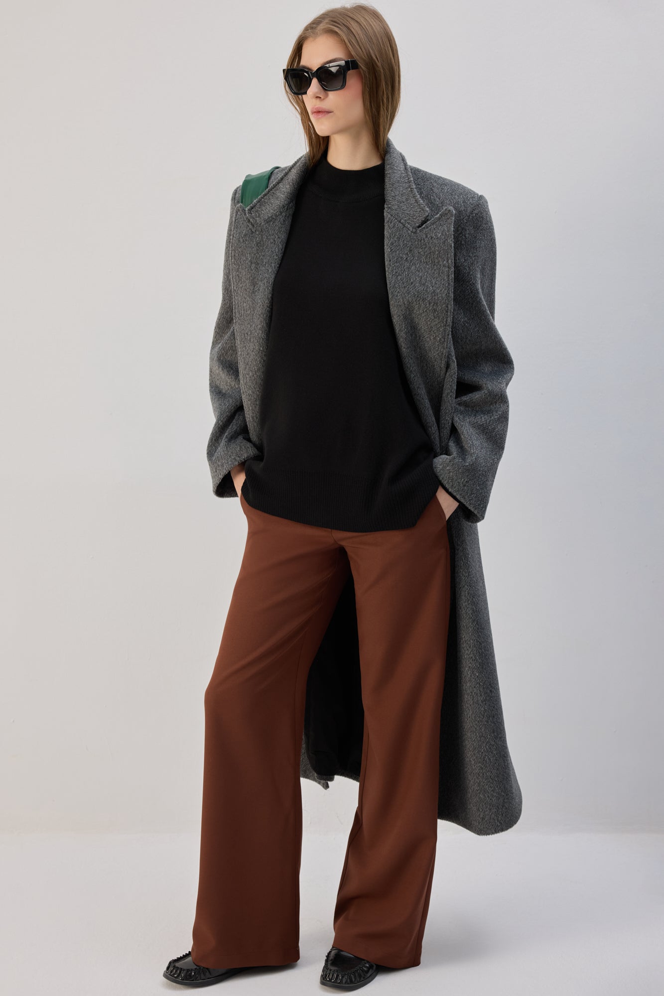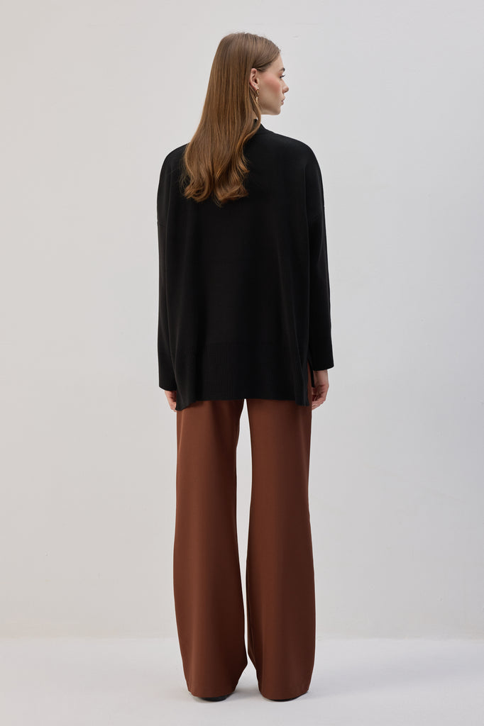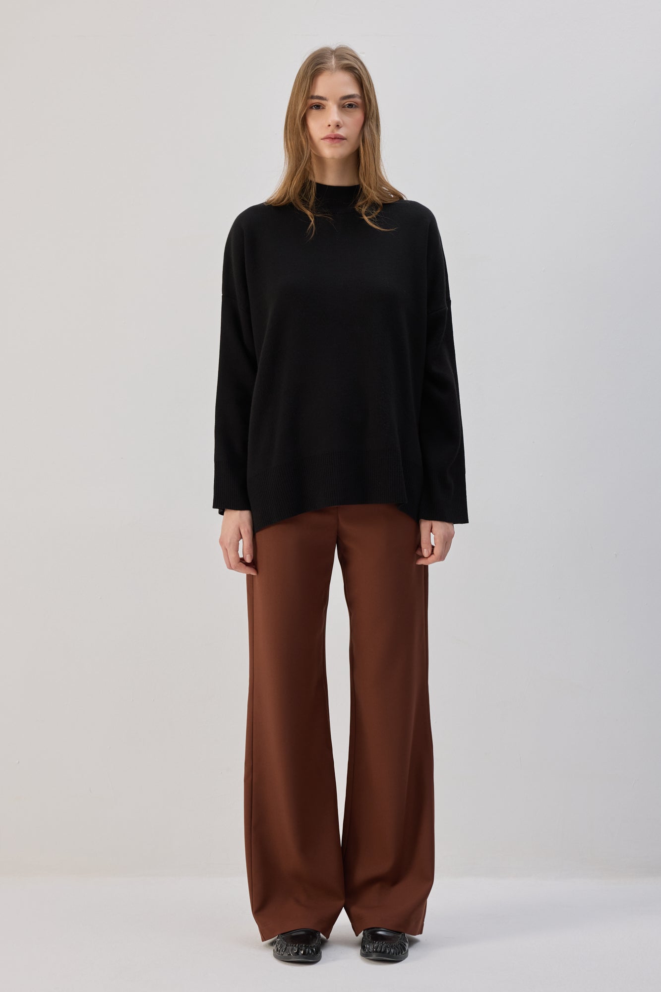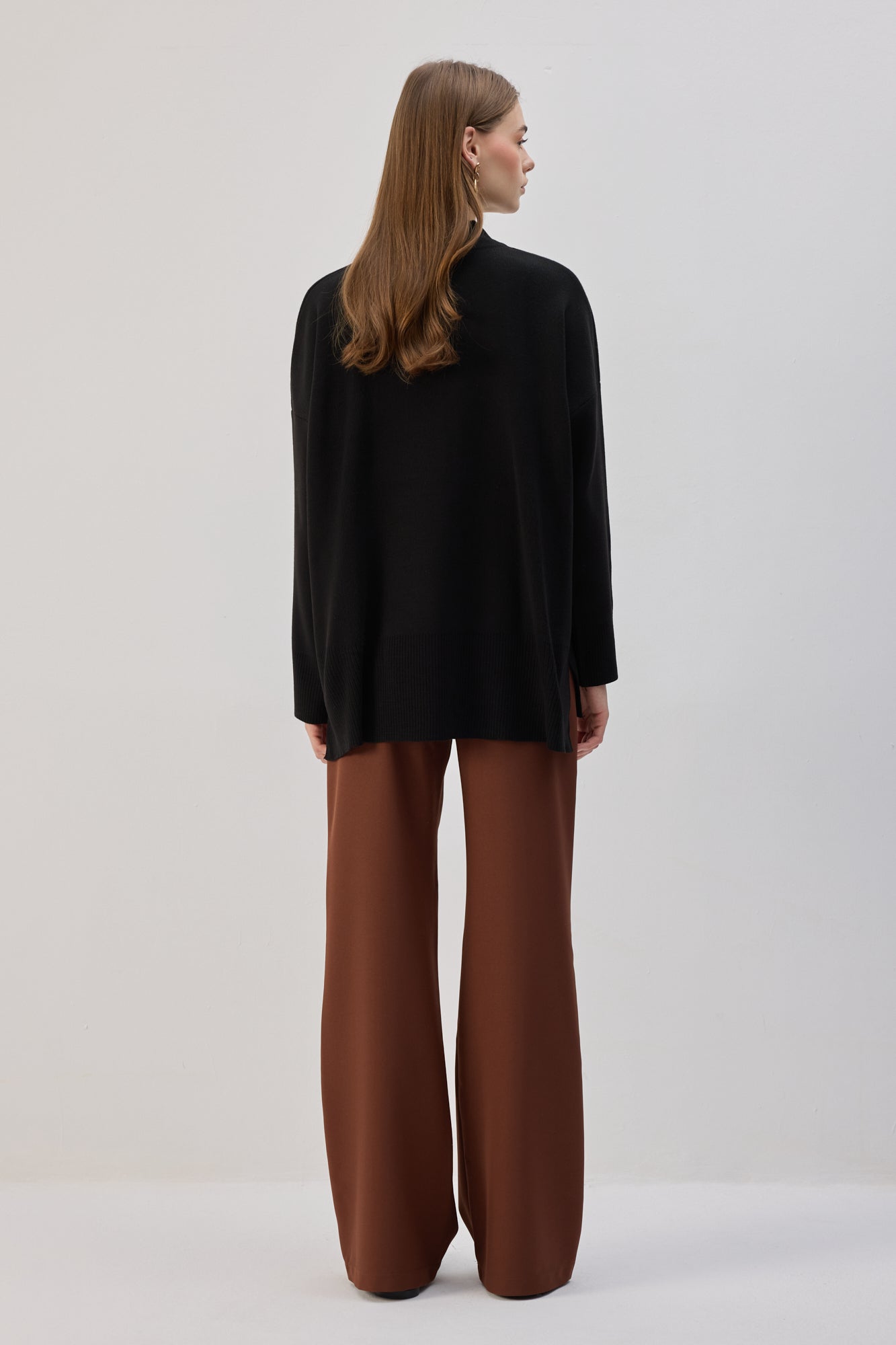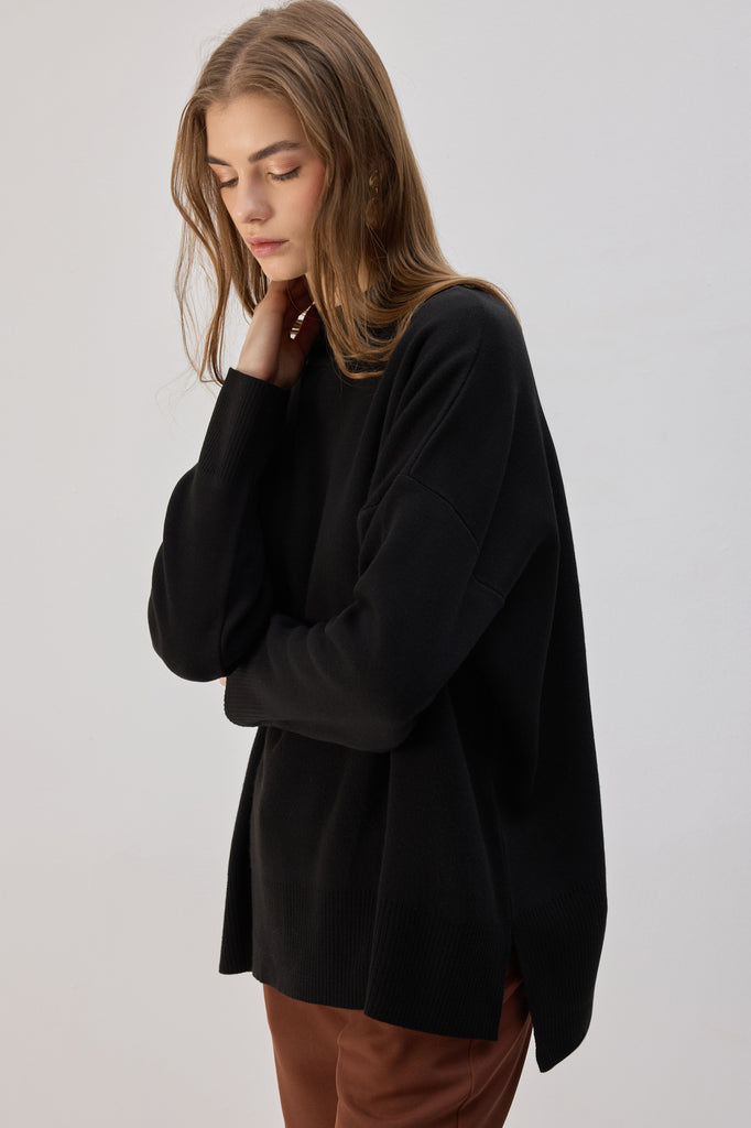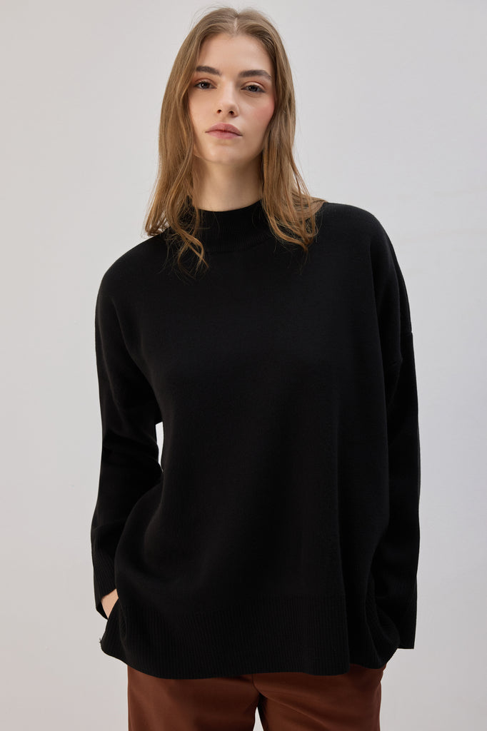 The Turtleneck Basic Knit Sweater is a staple of casual chic, offering comfort and versatility in a timeless design. This black sweater features a high, cozy turtleneck and long sleeves, made from soft, ribbed knit material. The relaxed fit makes it perfect for layering over a shirt or wearing on its own. Paired with denim jeans and ankle boots, it’s a refined yet casual look that can easily transition from day to night. Whether you're dressing it up or down, this sweater is a classic piece that complements any wardrobe.