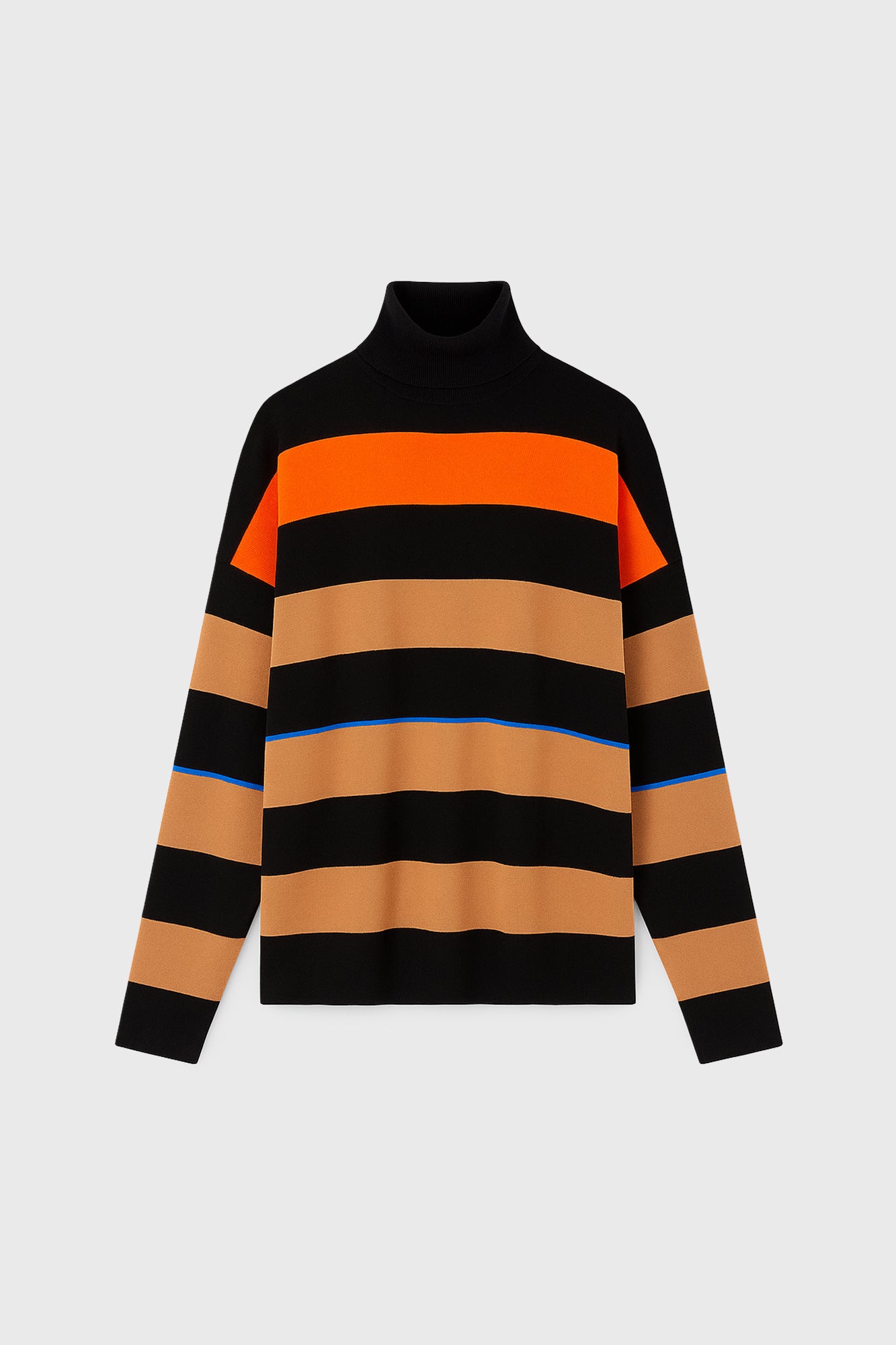 This striped knit tunic combines vibrant and neutral tones in bold patterns, offering a modern twist to a classic style. With its relaxed fit and high neckline, it provides warmth and comfort while maintaining a chic, contemporary look. Pair it with wide-leg trousers or tailored pants for an effortless yet sophisticated outfit. Made in Türkiye.