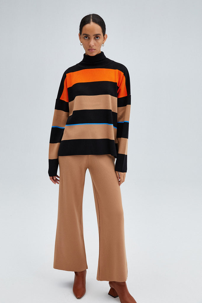 This striped knit tunic combines vibrant and neutral tones in bold patterns, offering a modern twist to a classic style. With its relaxed fit and high neckline, it provides warmth and comfort while maintaining a chic, contemporary look. Pair it with wide-leg trousers or tailored pants for an effortless yet sophisticated outfit. Made in Türkiye.